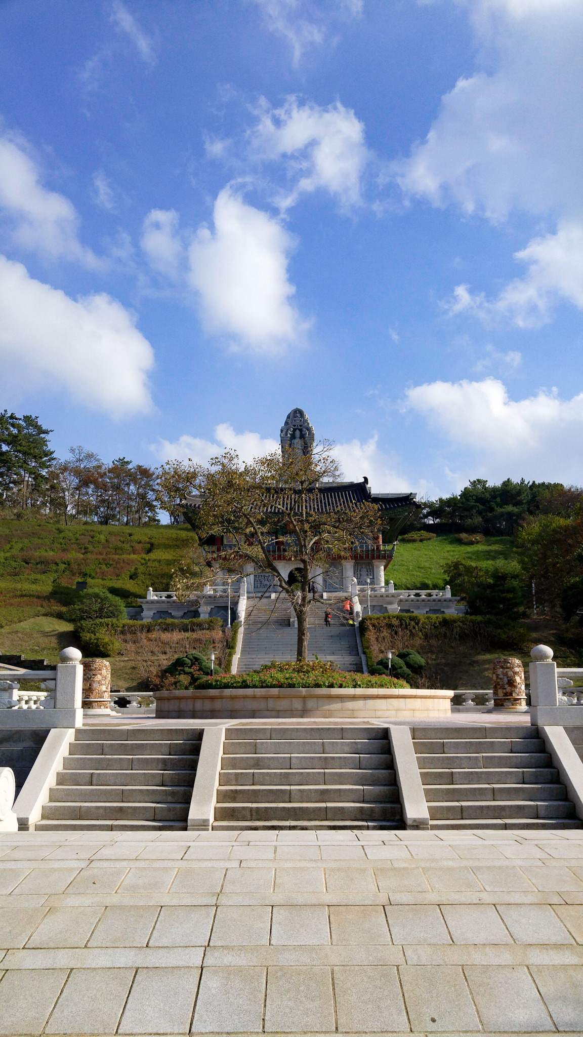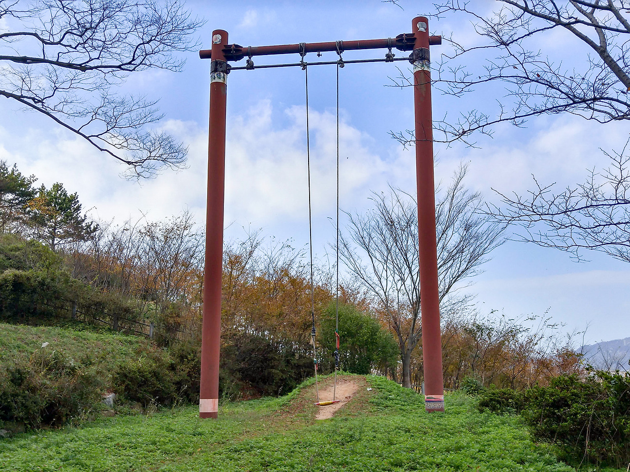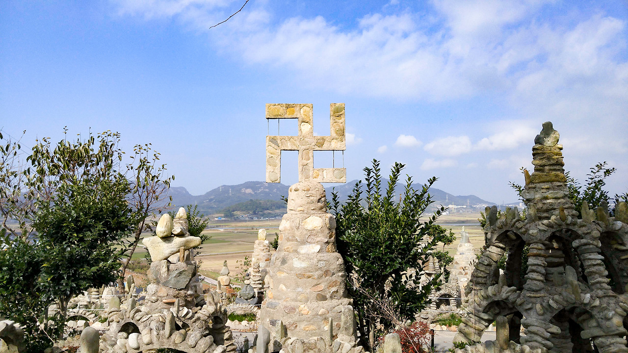 정자에서 내려와서 잠깐 걸으면 큰길로 빠져나오게 된다. 절이 하나 있는데 입구에 다양한 조형을 해놓았다.