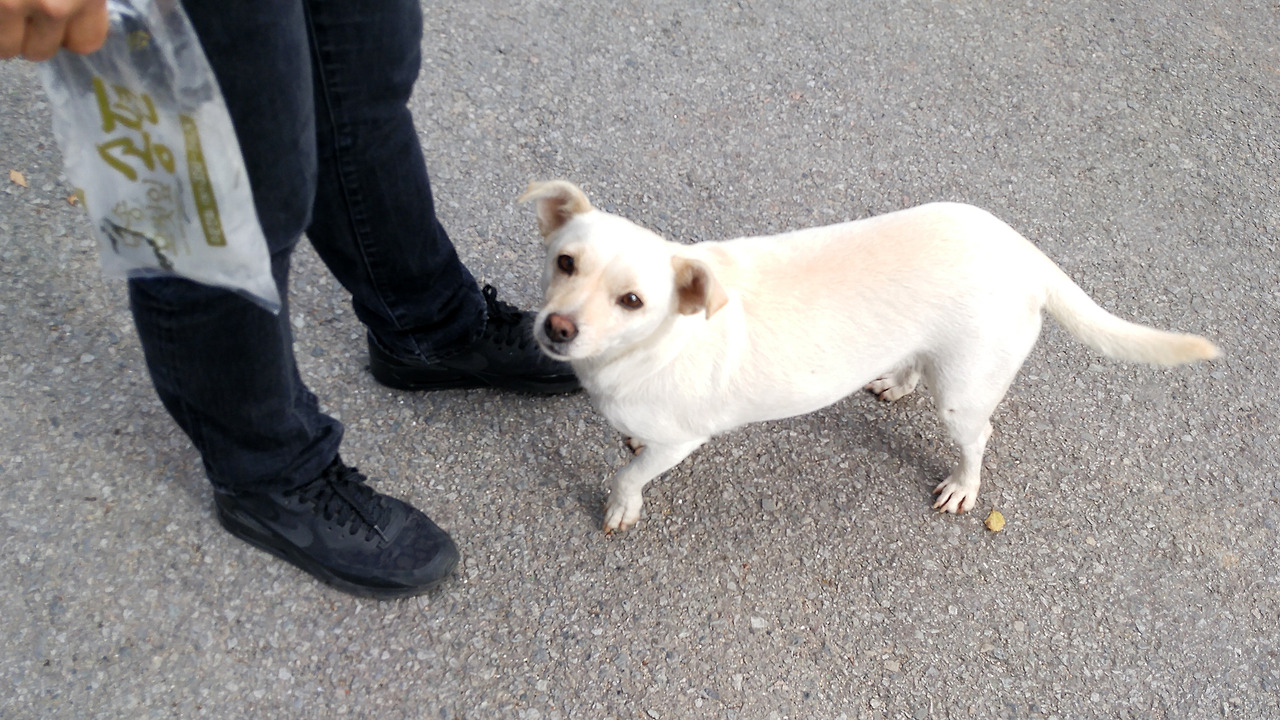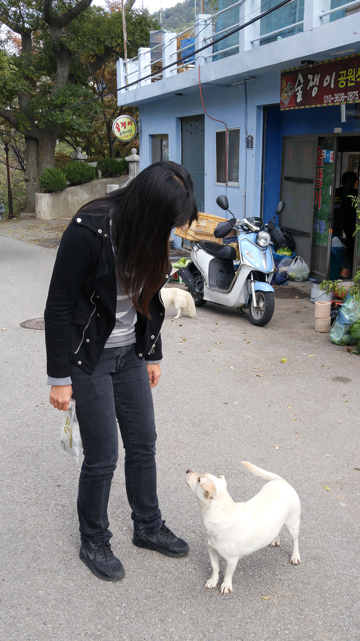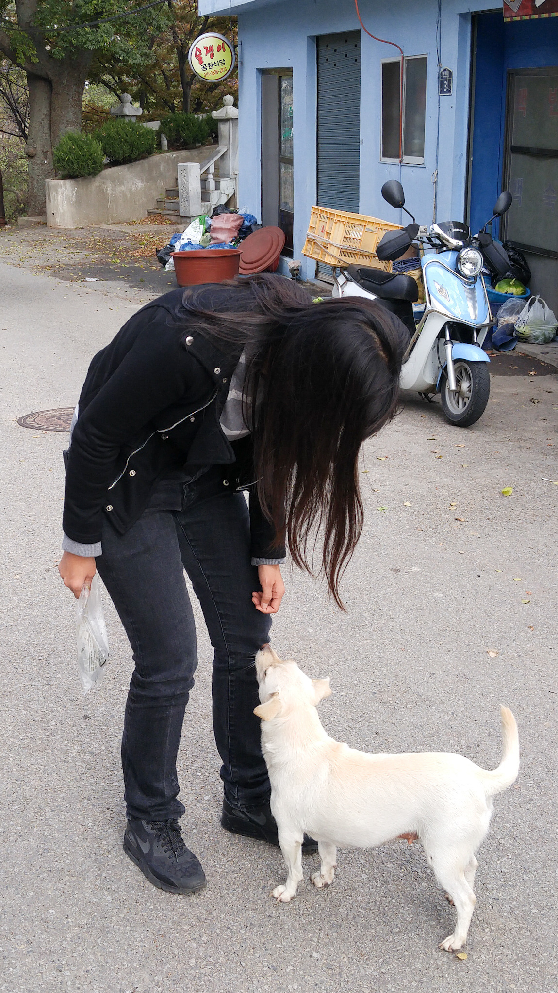 숲쟁이 쪽으로 잠깐 올라가니 식당에서 백구가 나와 우리를 반긴다. 순하고 정감있게 생겨서인지 지니님 마음에 들었나보다.