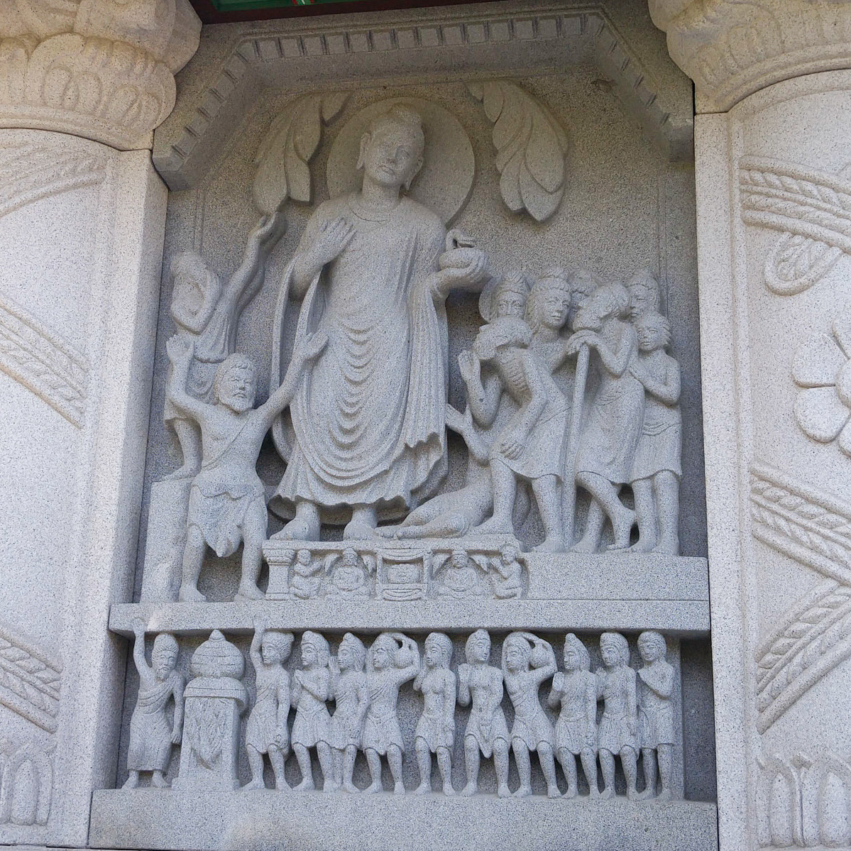 법당의 벽면을 빙 둘러서 부처님의 이야기가 조각되어 있다.