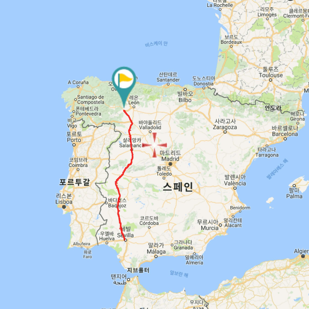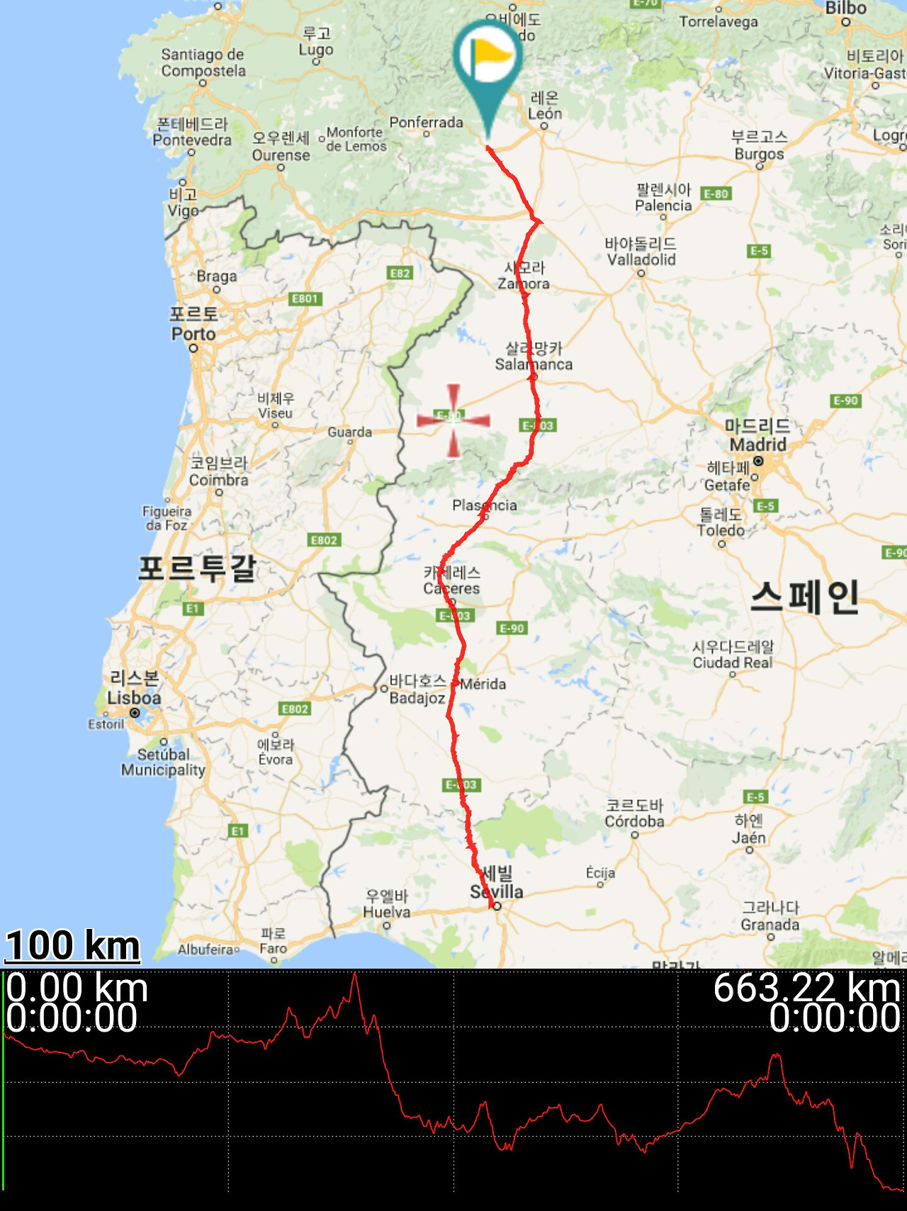 레온 옆의 아스토르가(Astorga)부터 시작하여 세비야(Seville)까지 약 670km를 달렸다.