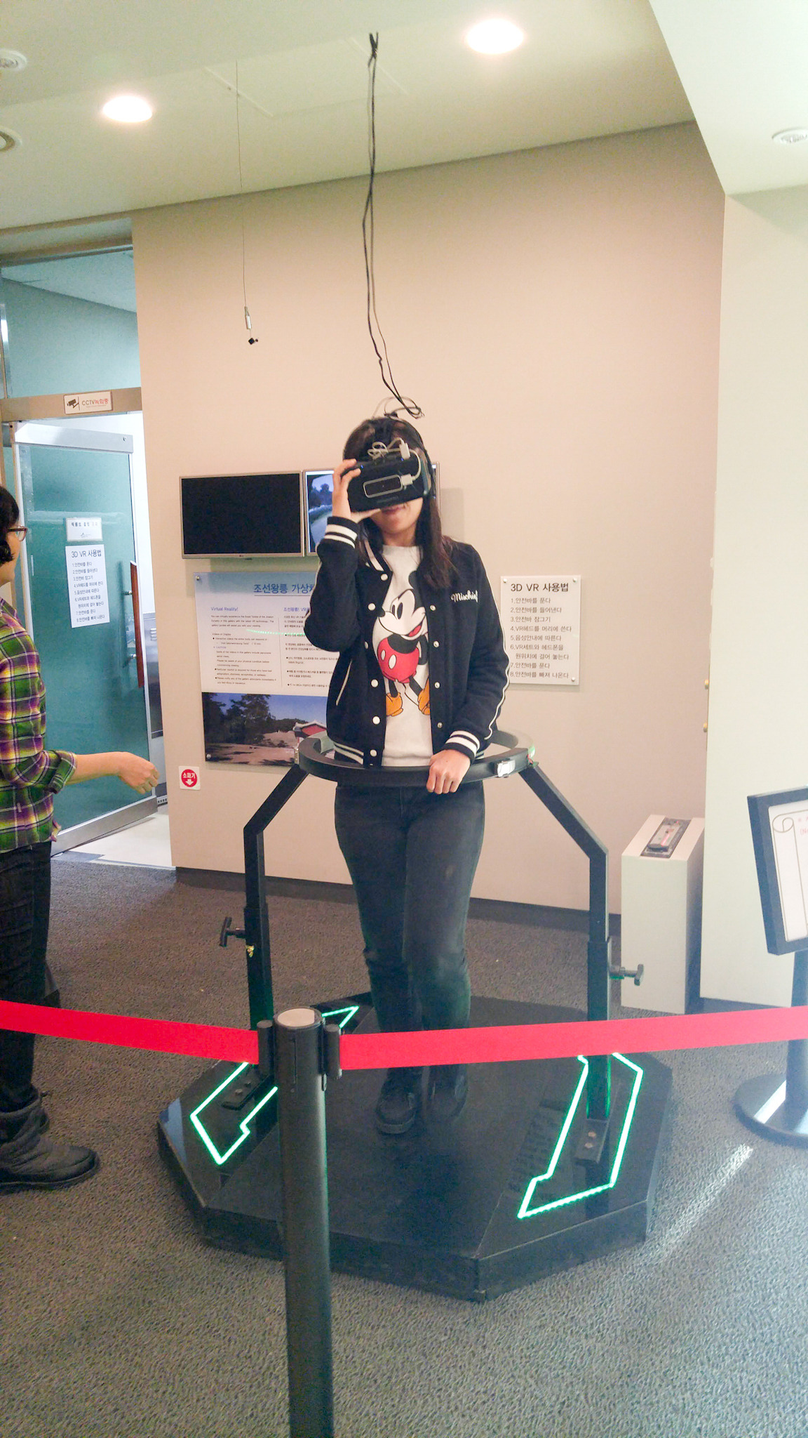 역사관 내부에는 지루한 문헌 자료들과 연대기 위주로 대단한 자료는 없지만 VR기기로 왕릉을 가상체험할 수 있는 기구가 있다. 지니님이 체험해본다. 가족 단위 관람객이 많지만 120cm 이하의 어린이는 사용할 수 없어 아이들이 실망한다.