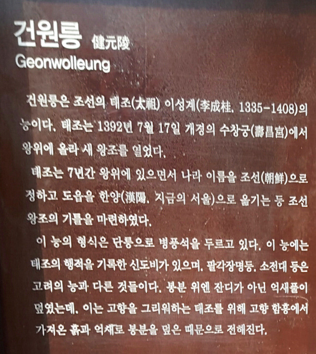 태조 이성계의 무덤인 건원릉은 구조는 다른 왕릉과 똑같지만 봉분에 이성계의 고향인 함흥에서 가져온 억새가 잔뜩 피어있다.