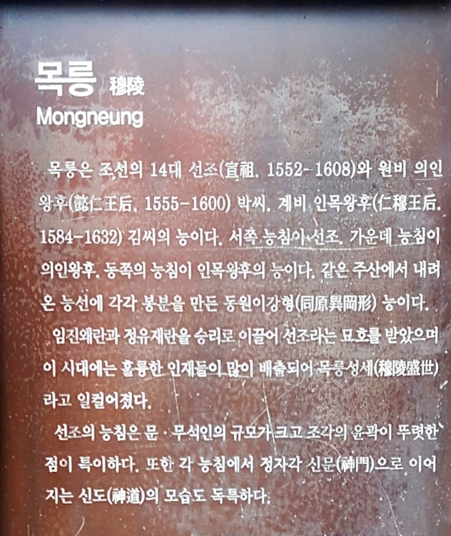 임진왜란의 망군이라 할 수 있는 선조의 무덤이다. 임진왜란에서 질 것 같으니 나라를 버리고 명나라로 도망가려한 왕이지만 결국엔 이긴 전쟁이라고 선조라는 묘호를 받았다고 한다. 선조 시대에 훌륭한 인재들이 배출되었다고 하는데 류성룡, 이순신, 이항복, 이이, 이황, 정철, 권율, 한석봉 등등 조선시대의 대표 위인으로 뽑을만한 사람들 대부분이 선조 밑에 있던 사람들이다. 이 정도의 인력이 있었으니 무능한 왕이라도 나라가 망하진 않았나보다.