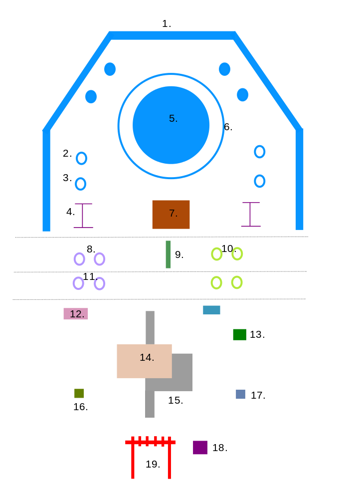 1. 곡장 2. 석호 3. 석양 4. 망주석 5. 봉분 6. 난간석 7. 혼유석 8. 문인석 9. 장명등 10. 석마 11. 무인석 12. 예감 13. 비각 14. 정자각 15. 참도 16. 수라간 17. 수복방 18. 배위 19. 홍살문