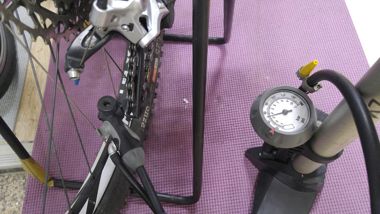 타이어가 물렁해졌다면 펌프로 공기를 주입하자. 이왕이면 몇 번만 넣어도 공기가 금방 채워지고 압력게이지가 달려 공기압 측정이 가능한 장펌프가 좋다.