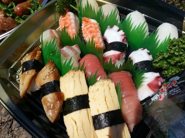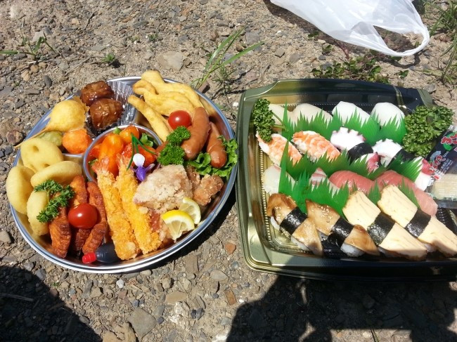 니이 시내를 조금 벗어나서 한적한 공터에서 사 온 도시락을 꺼냅니다. 모듬 튀김과 모듬 초밥 도시락입니다. 저렴하면서 푸짐한 것이 맘에 듭니다. 맛도 괜찮구요.