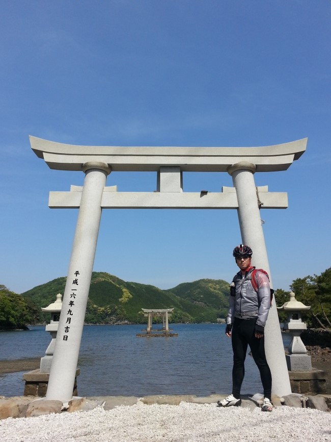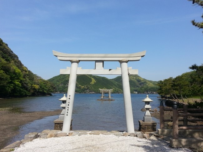 도리이라고 하는 신사 특유의 문이 5개 있는데 그중 2개가 바다 속에 있습니다. 이 신사의 특징이지요.