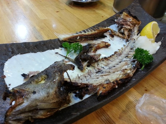 어지간한 메뉴를 다 먹고 나서 뭔가 다른 메뉴가 없는지 물어보았더니 무슨 생선이었는지 숙성한 생선을 반으로 갈라서 그대로 구워주는데 살도 많고 맛도 좋습니다.