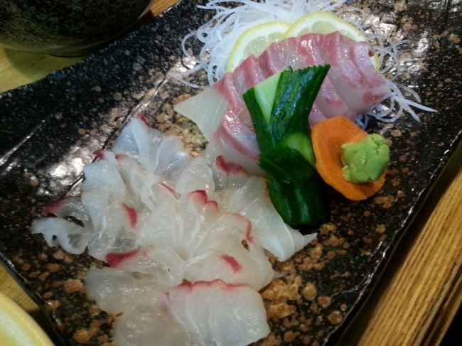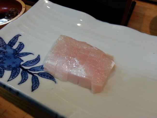 한참 기분 좋게 잘 먹으면서 주인장과 얘기도 나누고 있으니 가게 메뉴에서 가장 맛있는 것이라면서 참치회 한 접시를 소주 두 잔과 함께 서비스로 내줍니다. 마구로 같아 보이는데 입안에 넣으니 살살 녹네요.