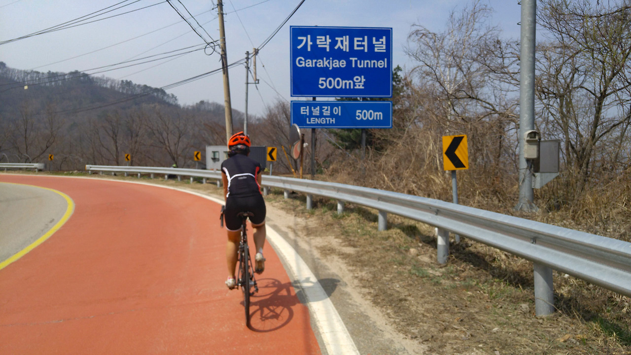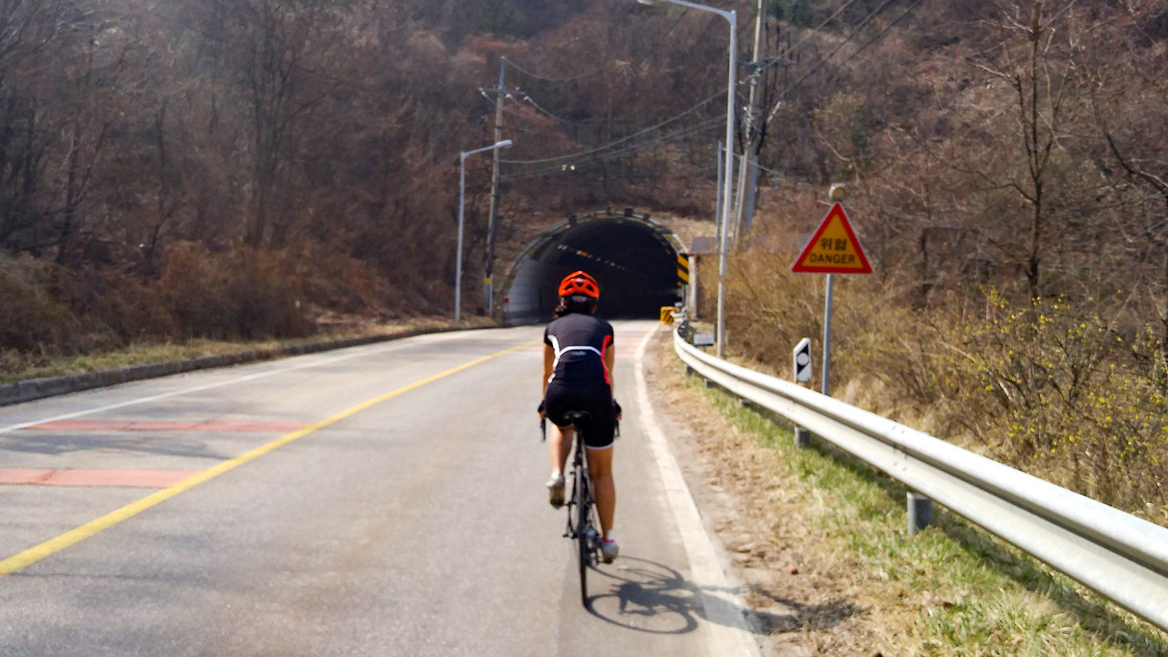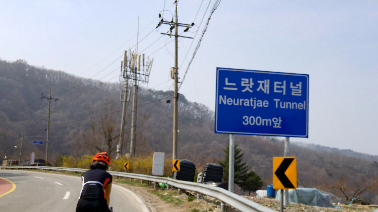 터널 안내 표지판이 나온다. 처음엔 900m 표지판이 나왔는데 오르막 900m면 자전거에겐 결코 가까운 길이 아니다. 터널 표지판의 숫자가 300m가 되면 곧 정상이다.