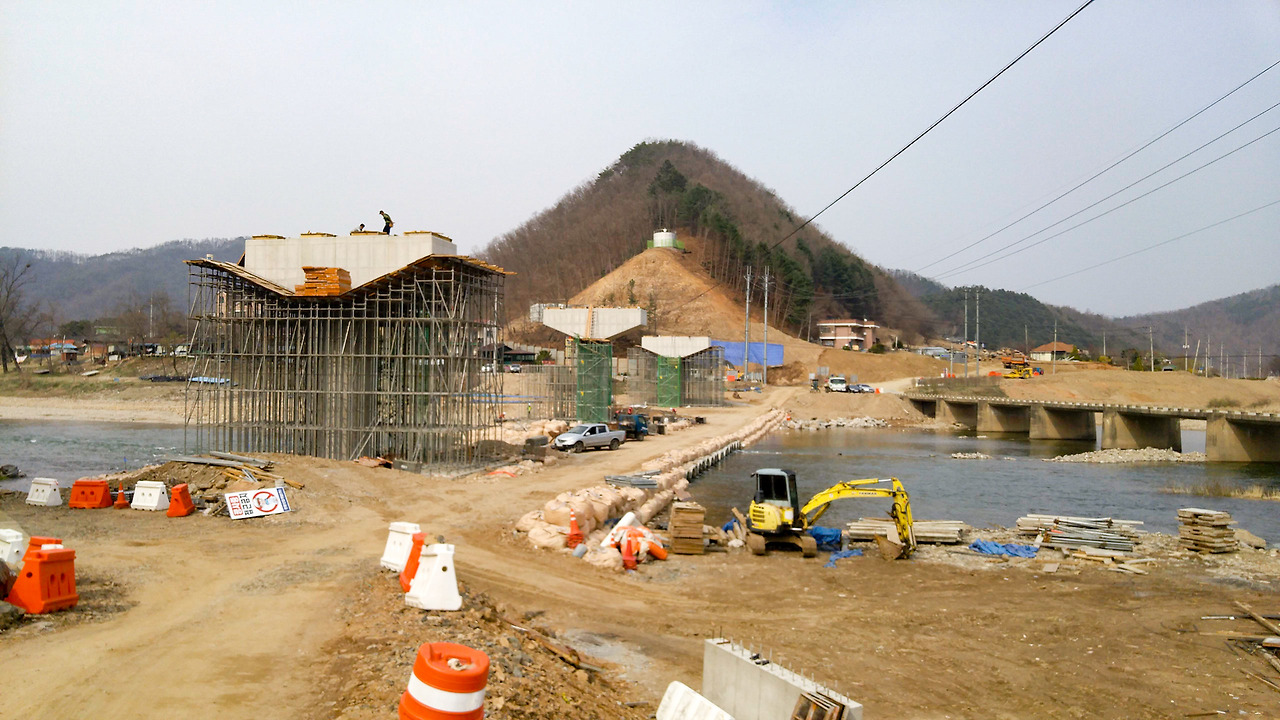 이 다리를 건너서 당고개를 넘어가면 팔봉산 유원지가 나타난다. 새로 큰 다리가 공사 중이다. 이 근처가 수심이 얕아서 여름엔 물놀이하는 사람들이 많다.