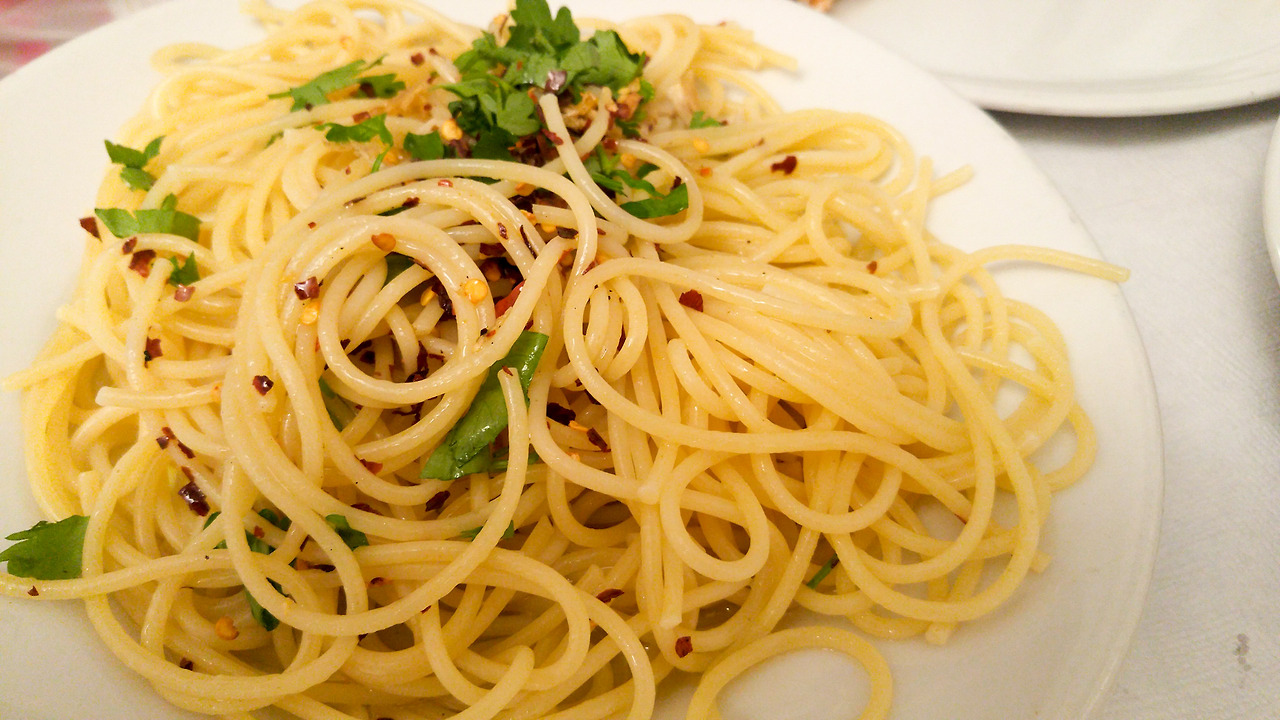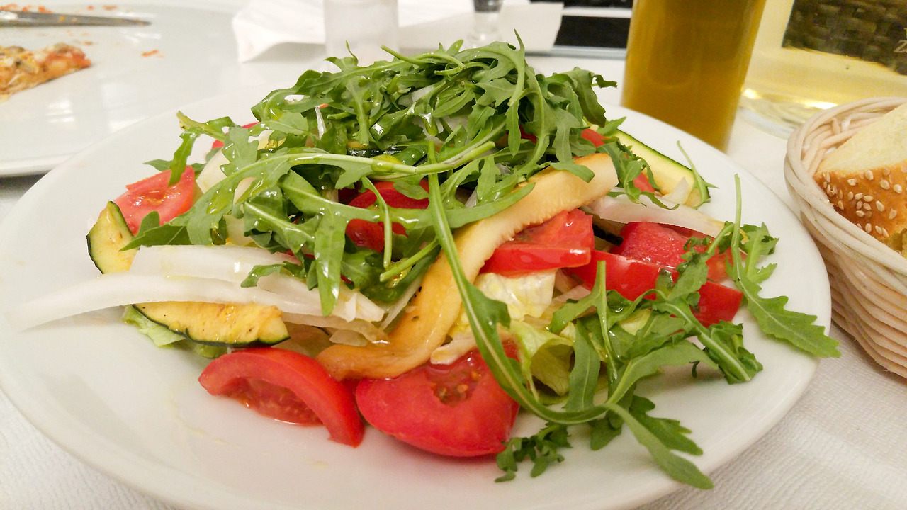 우리 정량은 세 접시다. 둘이서 두 접시는 모자르고 네 접시는 과하다. 세 접시를 나눠 먹으면 딱 배가 부르다. 샐러드와 알리오올리오 스파게티, 그리고 해산물 피자를 주문했다. 인터넷을 찾아보면 안티파스토 - 프리모 피아또- 세콘도 피아또 순으로 먹으면 된다는데 세트 메뉴로 먹을 때나 이렇게 먹고 단품으로 먹을 때는 현지인들도 피자나 파스타 한 그릇 먹고 마는 경우가 많다. 한 마디로 자기 맘대로 먹으면 된다.