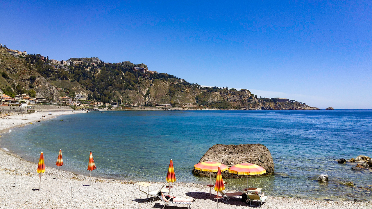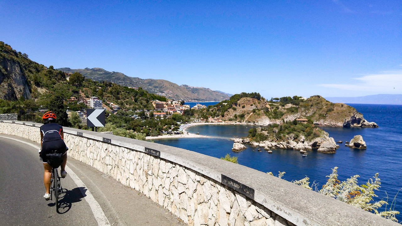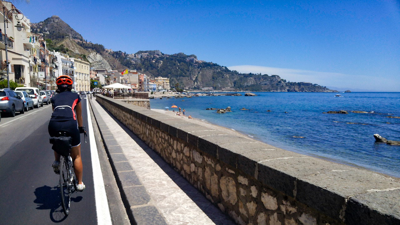 언덕 위에 있는 도시인 타오르미나(Taormina)가 보이는 해변길을 달린다.