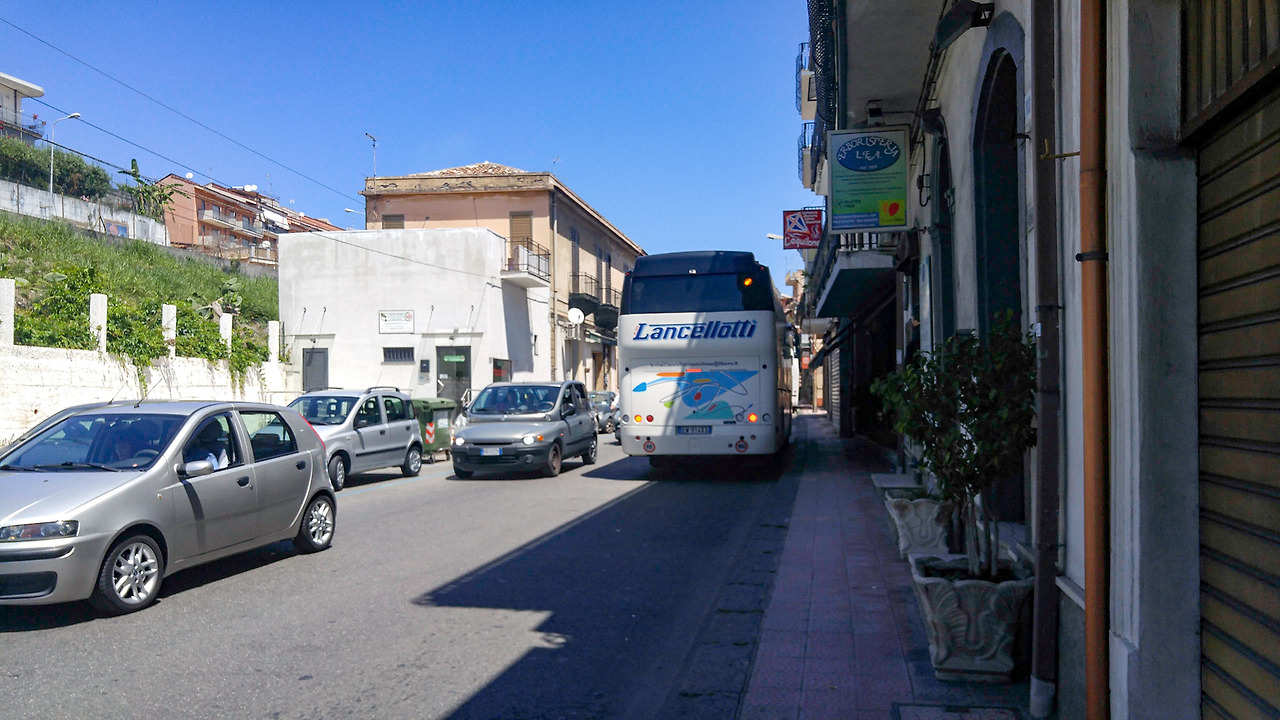 타오르미나 들어가기 전에 다시 SS114번 도로와 만났다. 무슨 일인지 버스들이 좁은 도로를 꽉 막아서 교통 체증이 엄청나다. 이럴 때는 자전거를 끌고 인도로 살살 지나가면 편하다.