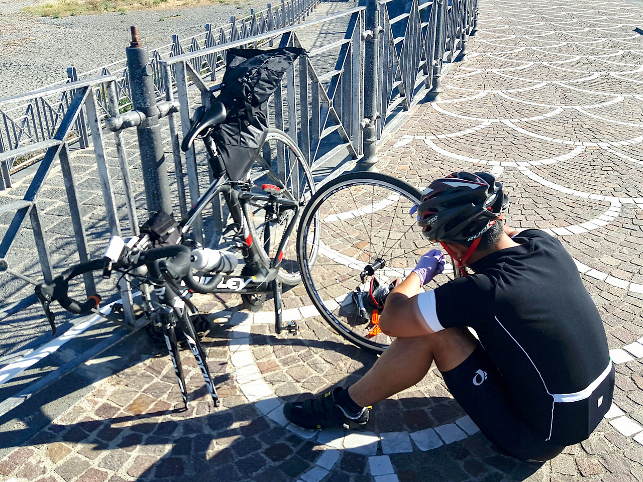 숙소에 도착할 때까지 버티려다가 수리하고 가기로 한다. 어차피 수리해야 하면 빨리 해버리자. 가느다란 철심같은 것이 앞바퀴에 박혀있다. 가끔 이런 철심을 밟고 실펑크가 나는데 이런 가늘고 뾰족하고 튼튼한 철심이 어디서 나오는 것인지 모르겠다.