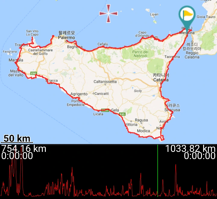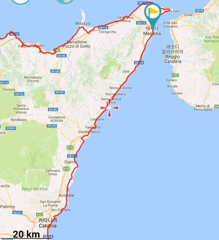 이동 경로 및 거리 : 카타니아 - 메시나 (100 km)