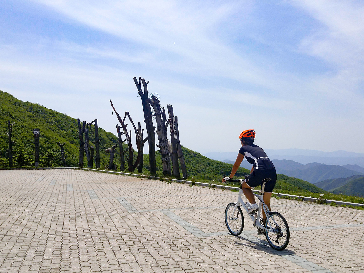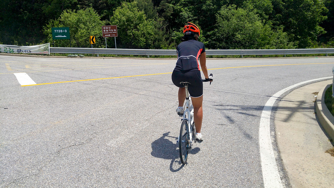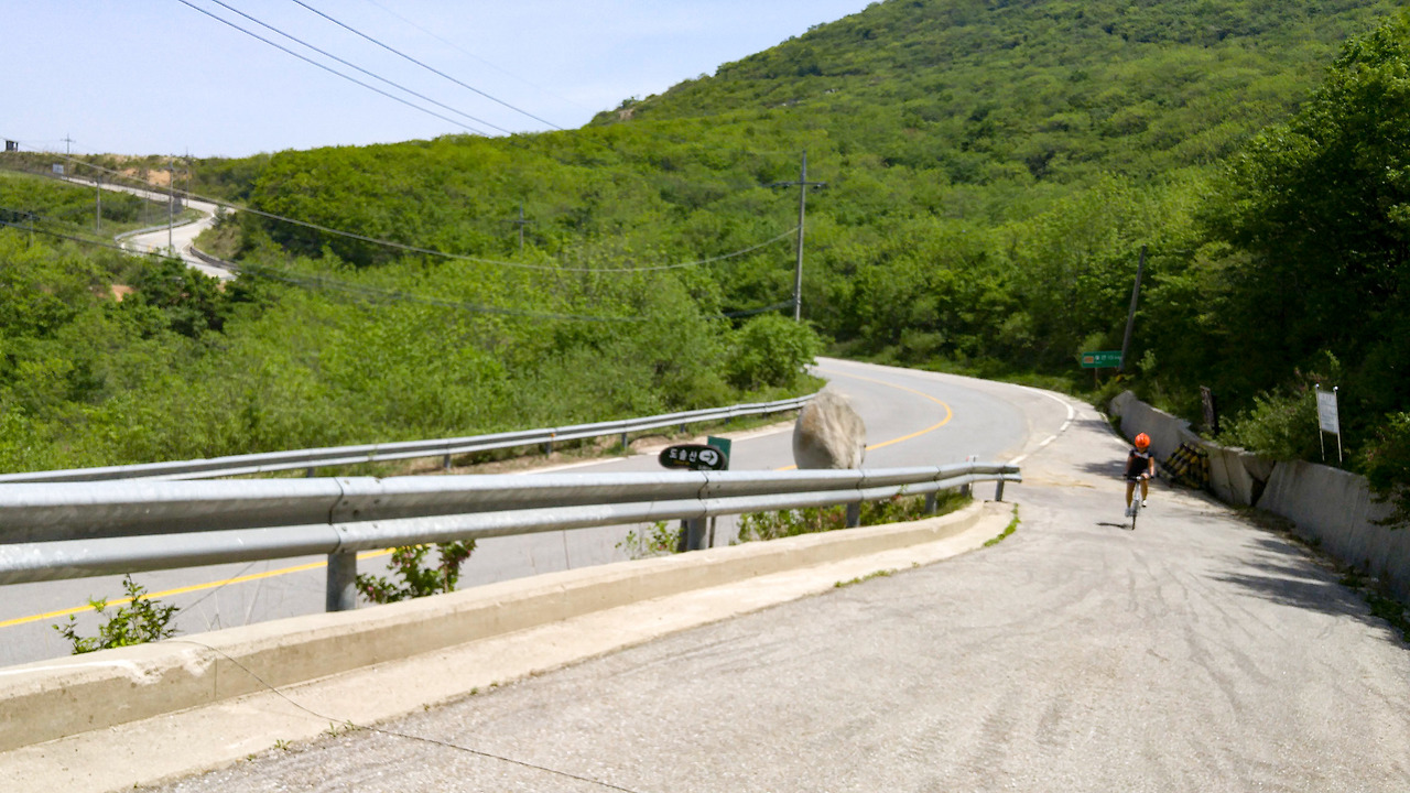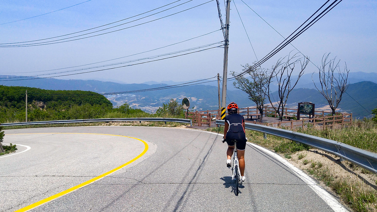 6 km 정도의 긴 오르막이니 느긋하게 올라간다. 우리 미니벨로가 로드자전거보다 빠르진 않지만 오르막 기어비가 더 낮기 때문에 편하게 올라갈 수 있다.
