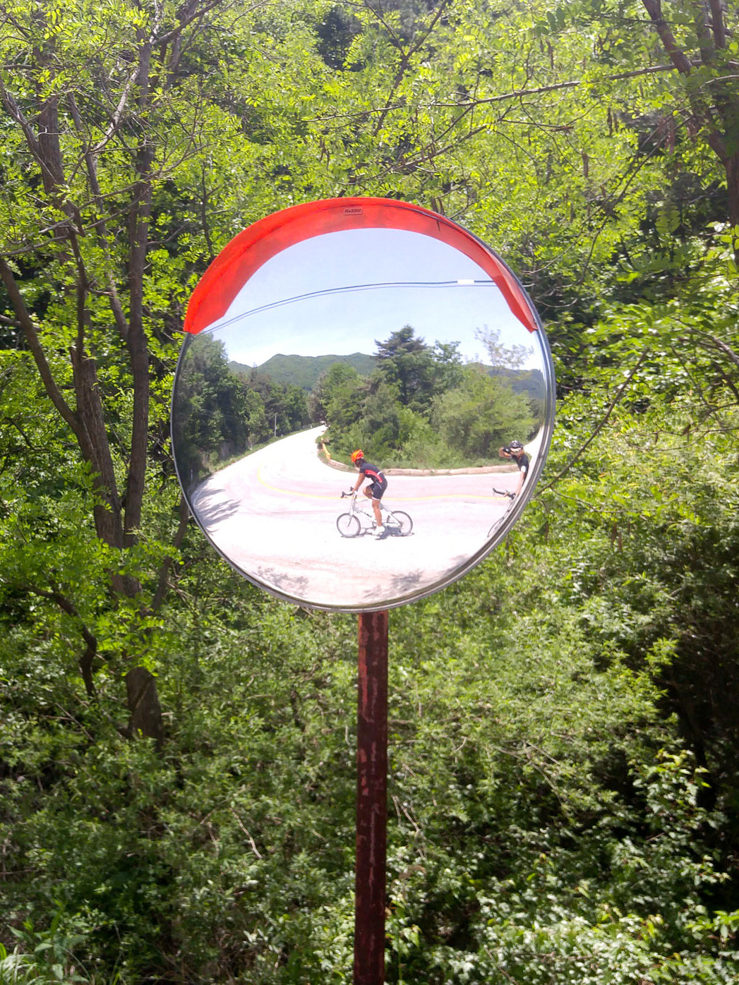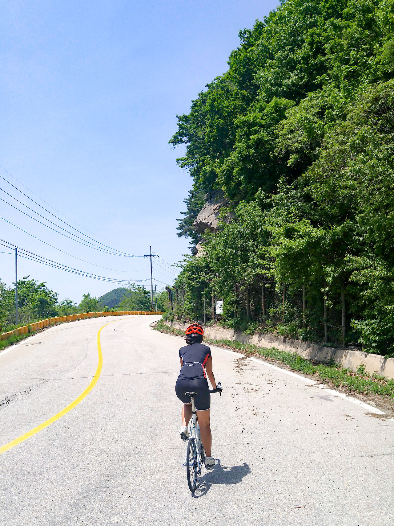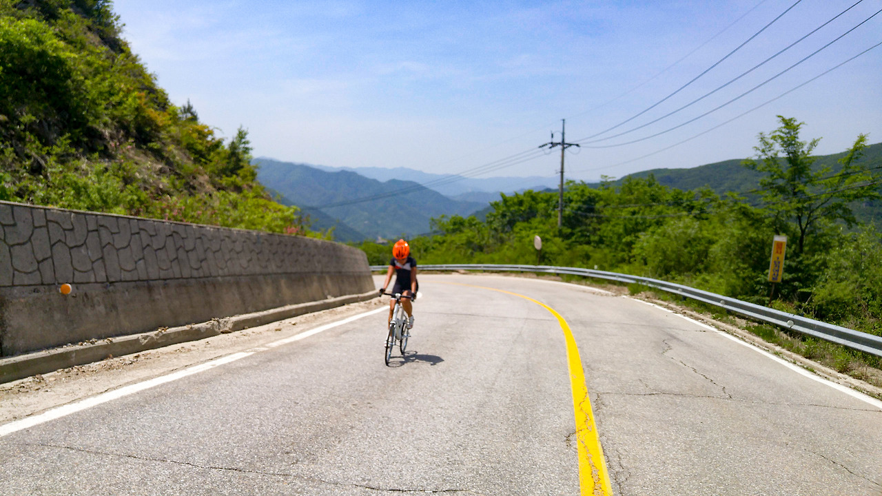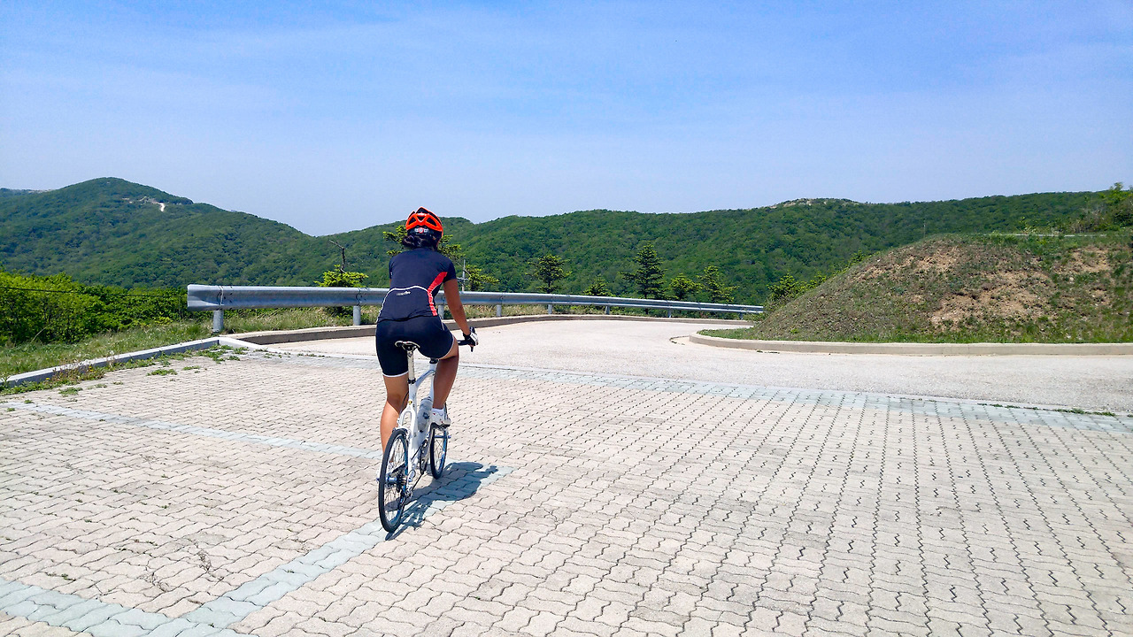 6 km 정도의 긴 오르막이니 느긋하게 올라간다. 우리 미니벨로가 로드자전거보다 빠르진 않지만 오르막 기어비가 더 낮기 때문에 편하게 올라갈 수 있다.