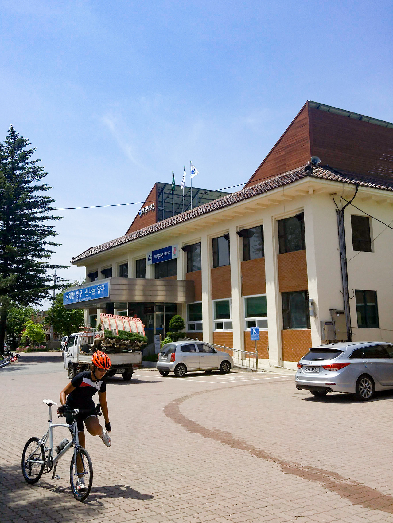 자동차에 자전거를 싣고 양구군 동면 사무소에 도착한다. 자동차로 이동할 경우에 가장 주차하기 쉬운 곳이 면사무소이다. 주차가 쉽고 주말에도 화장실이 개방되어 있으면서 근처에 식당이나 슈퍼, 편의점도 있으니 차에서 자전거를 내리고 출발을 준비하는데에 안성맞춤이다.