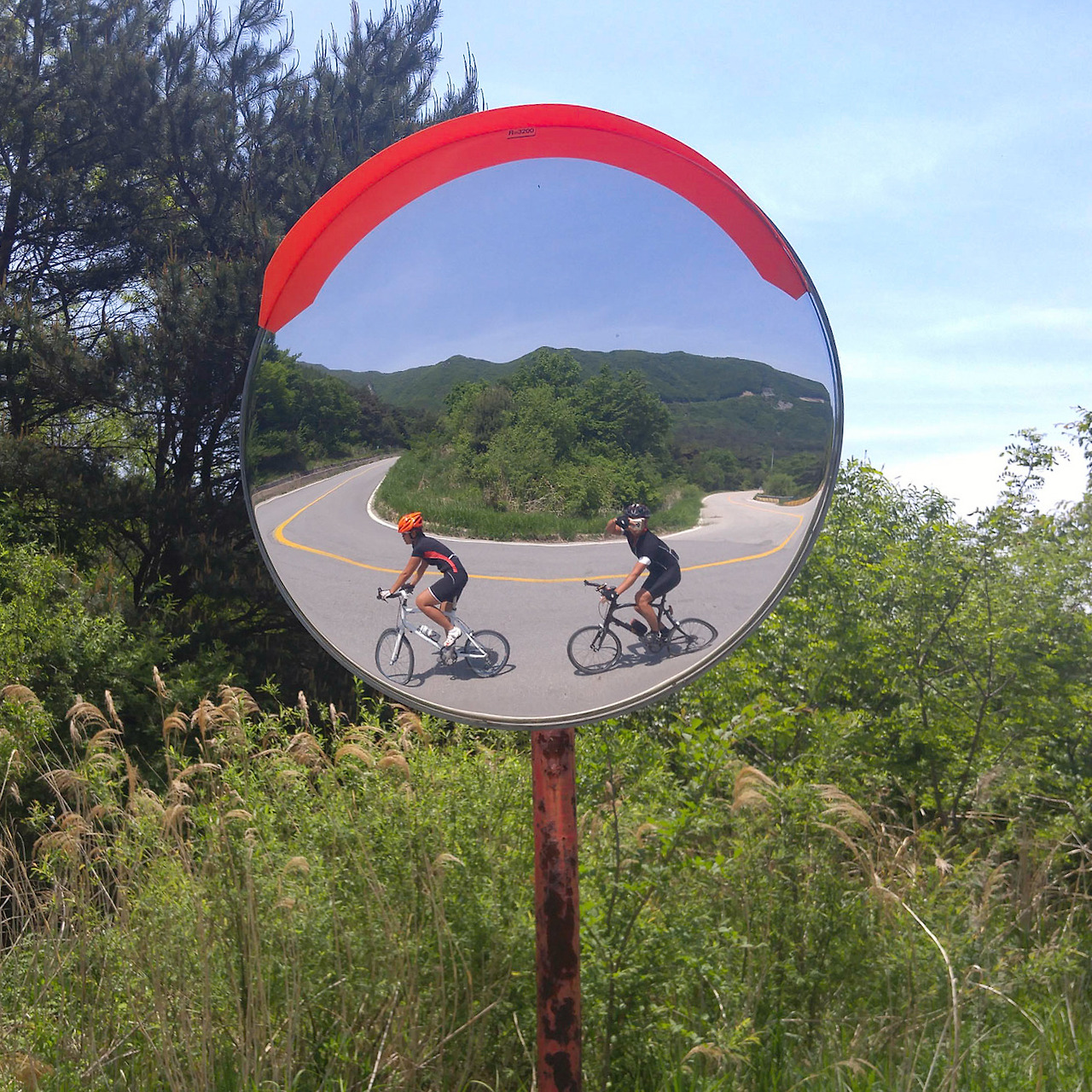 경사가 심하진 않지만 급커브길이 많아서 안전거울도 많다.