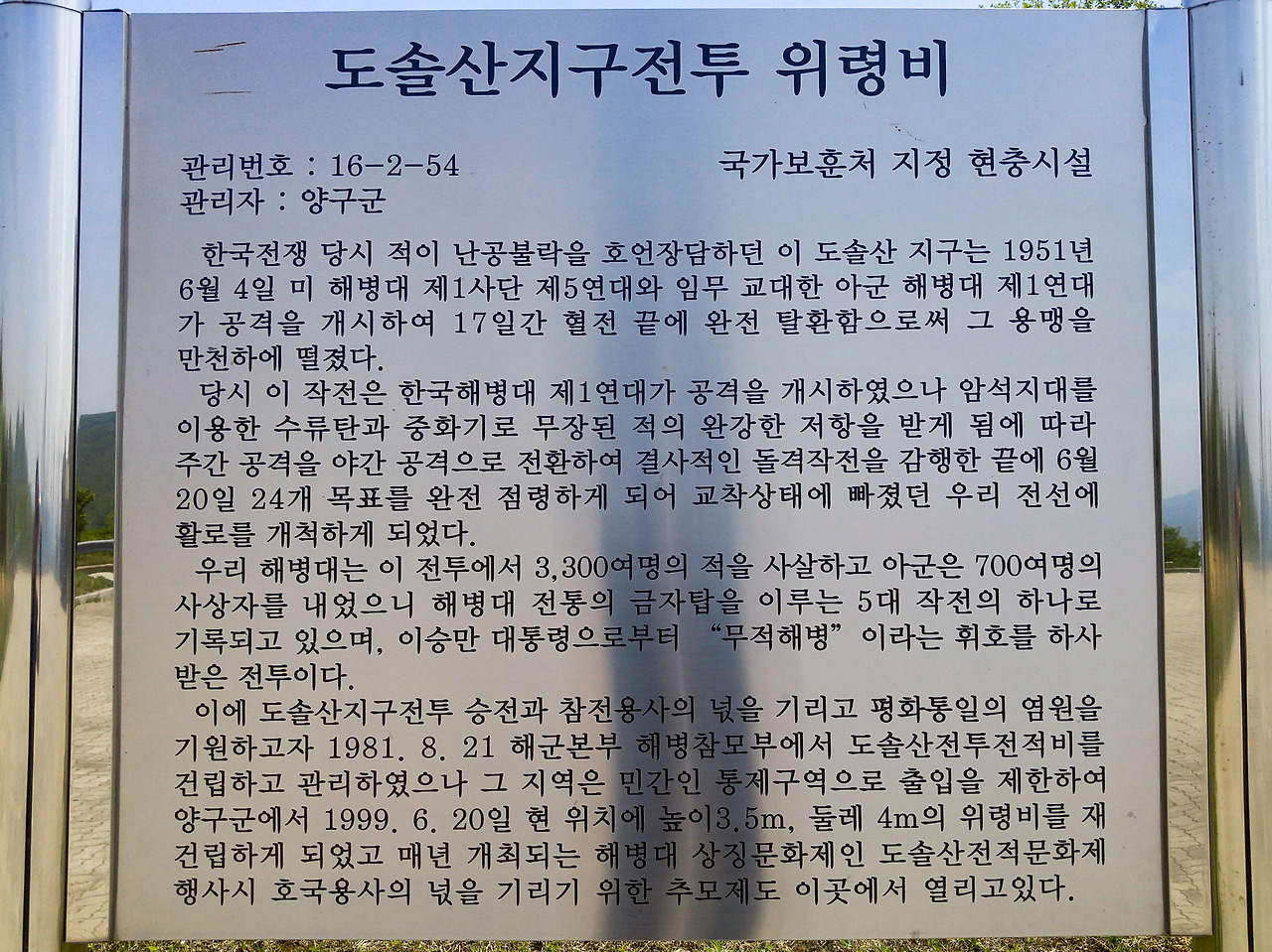 이것이 도솔산지구 전투 위령비이다. 무적해병이란 말이 도솔산 전투에서 큰 승리를 거두고서 시작되었다고 한다. 전쟁이 일어나자 국민을 버리고 가장 먼저 도망간 자가 준 호칭이라니 그리 좋아보이지는 않는다.