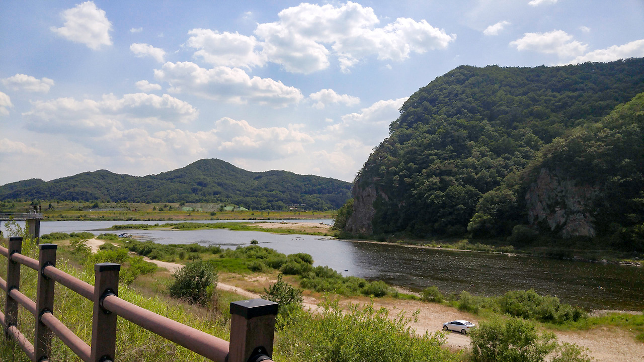 섬강과 남한강이 만나는 두물머리이다. 물놀이하러 온 사람들이 있는데 저 차는 자전거길을 주행해서 차량 출입이 통제한 자전거길 시설을 다 망가트리고 들어간 차이다.