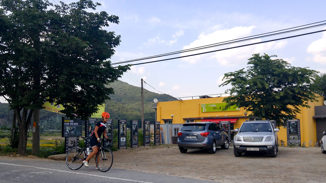 옥천면 입구에서 아침 겸 점심을 먹기로 한 식당에 들르기로 한다. 자전거길에서 식당으로 바로 내려갈 수 있는 길을 만들어놨는데 경사가 급하니 살살 끌고 내려가야 한다.