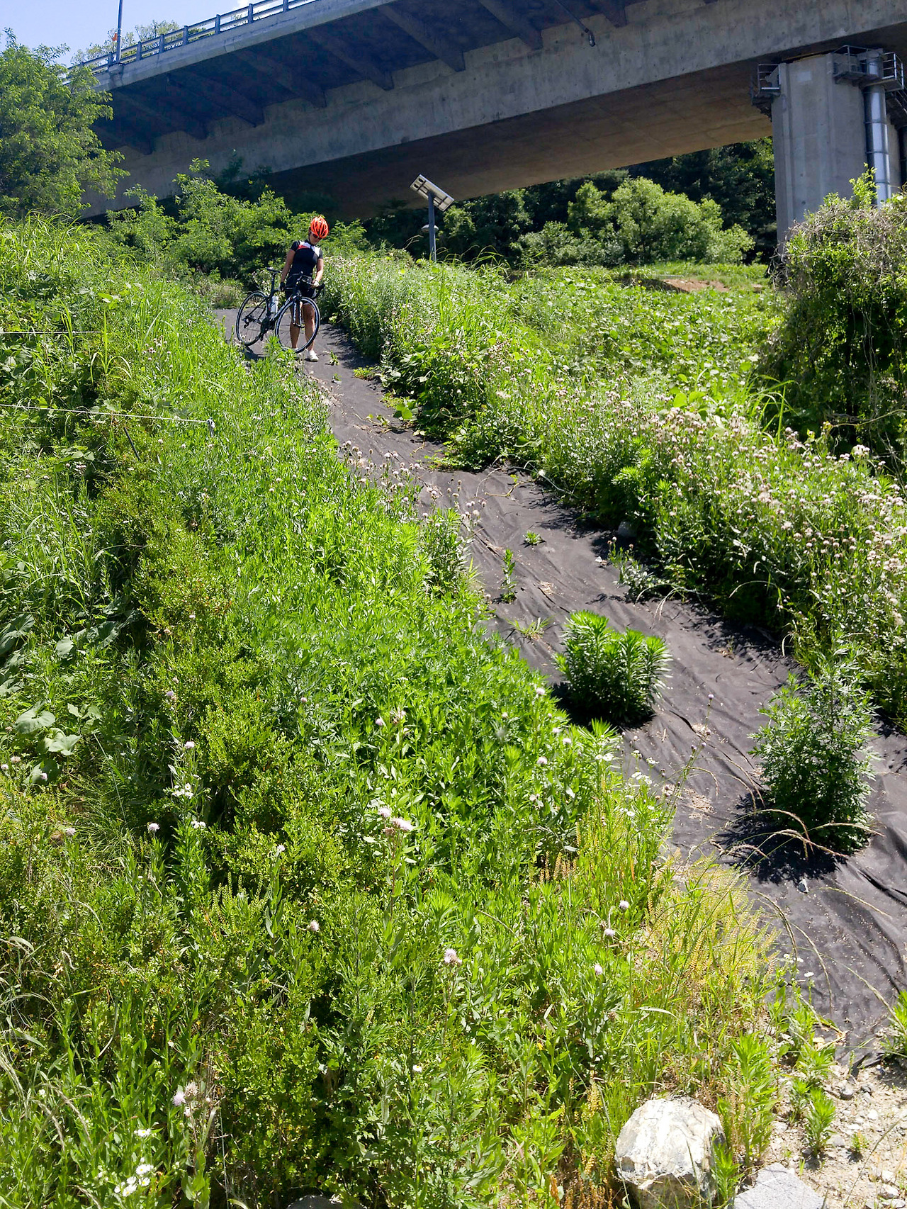 강천보 끝에는 급경사길의 안전사고 때문에 자전거를 타고 갈 수 없게 해놓은 시설이 있다. 자전거에서 내려서 조심조심 끌고 내려간다.