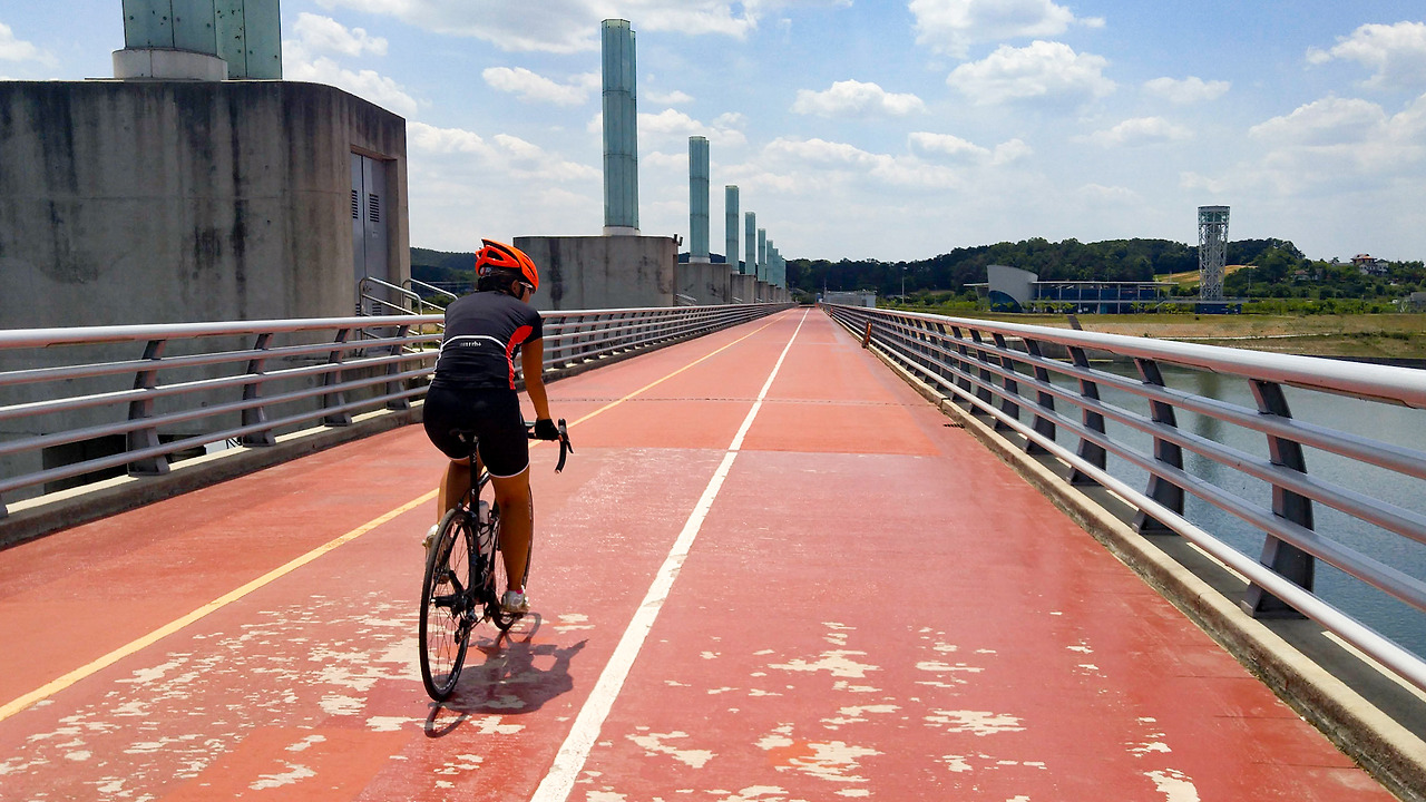 조정지댐 입구에서 바로 자잘한 진동으로 그리 좋지 않은 데크길을 빠져나가면 자전거길이 계속 이어진다.