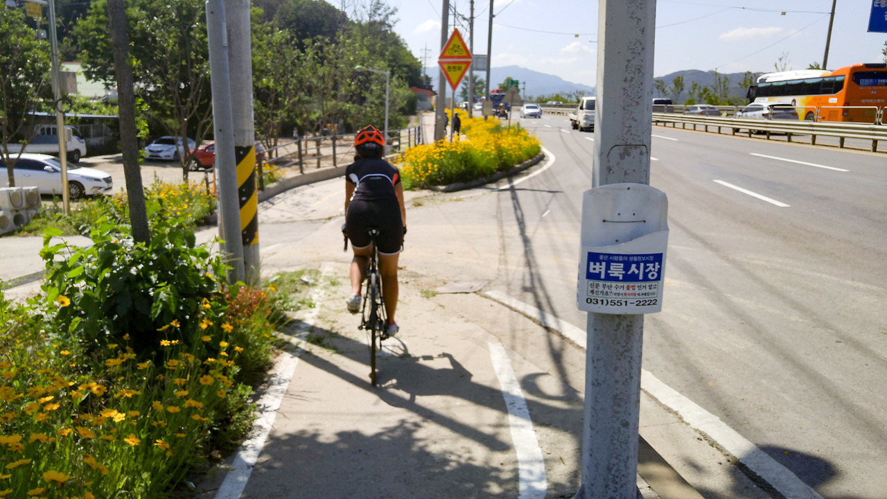 도로 양 옆에 노란 꽃길이 펼쳐지니 원래 좀 지루했던 자전거길 구간이 화사하게 바뀌었다.