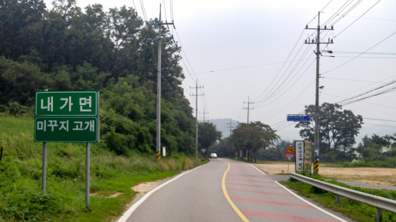 아까 넘어왔던 미꾸지고개가 보인다. 반대로 넘어가면 곧 내가면사무소다.