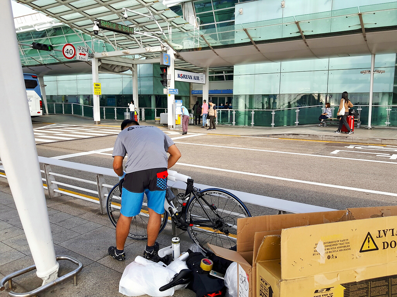 공항에 도착하자마자 자전거를 내려서 포장을 한다. 단골 가게에 미리 얘기해서 자전거 박스를 한 달 전에 미리 구해두었다. 자전거 가게에서 그냥 버리는 자전거 박스라도 구하려 하면 이상하게 잘 안 구해지니 미리미리 구해두어야 한다. 들어있던 완충재와 포장재까지 함께 구해오면 더욱 완벽하다. 지난 시칠리아 여행에서의 자전거 파손 사고도 있어서 이전보다 더 꼼꼼하게 포장했다.
