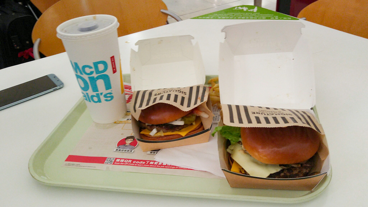 대기 시간이 길고 기내식은 부실하니 배가 고픈데 게이트 쪽 2층 푸드 코트에는 먹을만한 것이 없어 보인다. 비싼 일본 라멘집은 지난 번에 로마에서 먹었었고 중국 사람들이 잔뜩 줄 서서 받아먹고 있는 이상한 중국 음식들을 먹기는 싫으니 맥도널드 햄버거라도 먹기로 한다.
