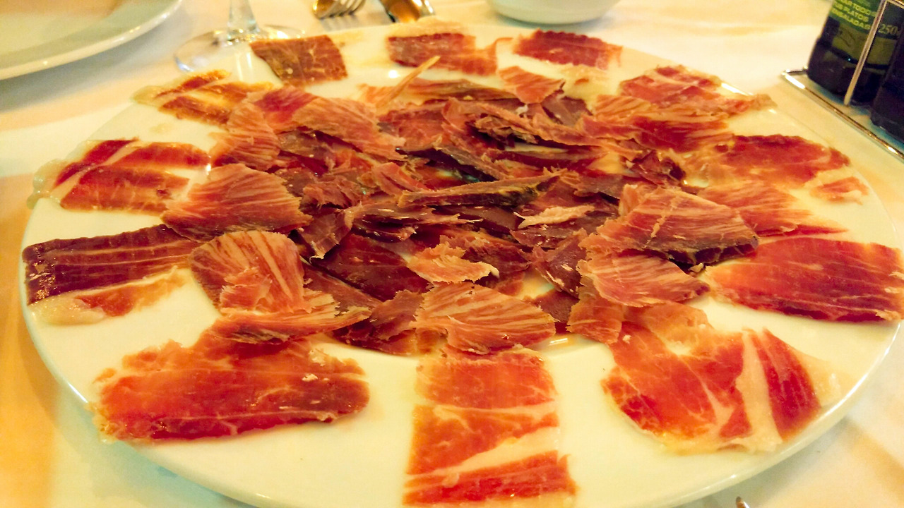 아주 만족스러운 하몽 이베리코 데 베요타와 빠에야가 나왔다. 하몽은 세라노> 이베리코 세보> 이베리코 데 베요타로 등급을 크게 나눌 수 있는데 보통 수준이 어느 정도 되는 식당에서는 하몽 이베리코 이상을 판매한다. 세라노는 백돼지라 발굽이 하얗고 이베리코 등급부터는 흑돼지라 발굽이 까맣기 때문에 식당에서 손질해놓고 썰어주는 하몽이 이베리코 등급 이상인지 아닌지는 어렵지 않게 알 수 있다. 이베리코 데 베요타는 숙성 기간이 길기 때문에 좀 더 육포 같은 느낌이 나서 지니님보다는 내가 더 좋아한다.