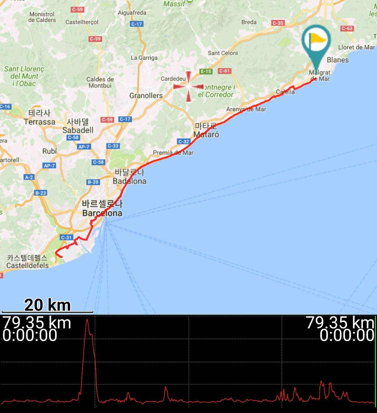 이동 경로 및 거리 : 바르셀로나 엘프라트 공항 - 말그랏 데 마르(Malgrat de mar) 80km