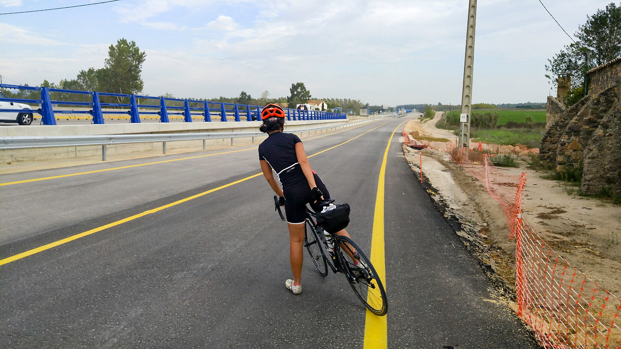 한참 달리는데 도로가 공사 중이라 좁아진다. 가뜩이나 헤로나로 가는 차들이 많은데 2차선이 1차선으로 줄어드니 아무리 차들이 친절하게 양보해준다고 해도 우리 때문에 교통 체증이 더 생기는 듯하다. 더군다나 곧 자동차 전용 도로가 시작된다는 표시가 있다. N-II 도로의 일부 구간이 자동차 전용도로가 되는 구간이다. 마침 지니님이 도로 구석에 멈추더니 옆 길을 보라고 한다. 깨끗하게 포장되어 있으면서 도로 공사로 막혀서 차 한 대 안 다니는 넓은 도로가 있다.
