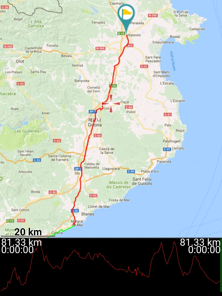 이동 경로 및 거리 : 말그랏 데 마르(Malgrat de mar) - 피게레스(Figueres) 82 km