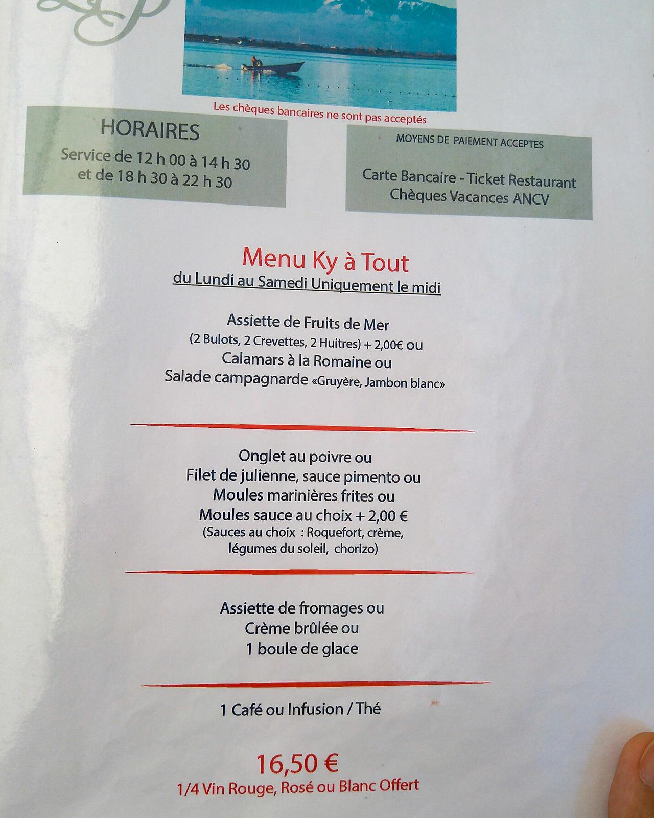 어쨌든 해변가 마을에 도착했다. 바르카레스(Le Barcares)라는 마을이다. 페르피냥 이후 제대로 먹은 게 없는데 식당들도 쭉 있으니 여기서 점심을 먹도록 한다. 테라스 쪽에 앉아서 메뉴판을 받아 들었더니... 모르는 단어들이 쏟아진다. 일단 점심으로 먹기 가장 좋은 "오늘의 메뉴"에서 고르기로 한다. 시간도 아슬아슬하게 2시 반이다.