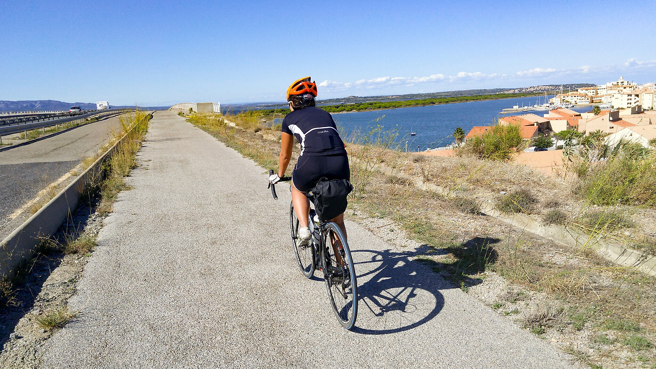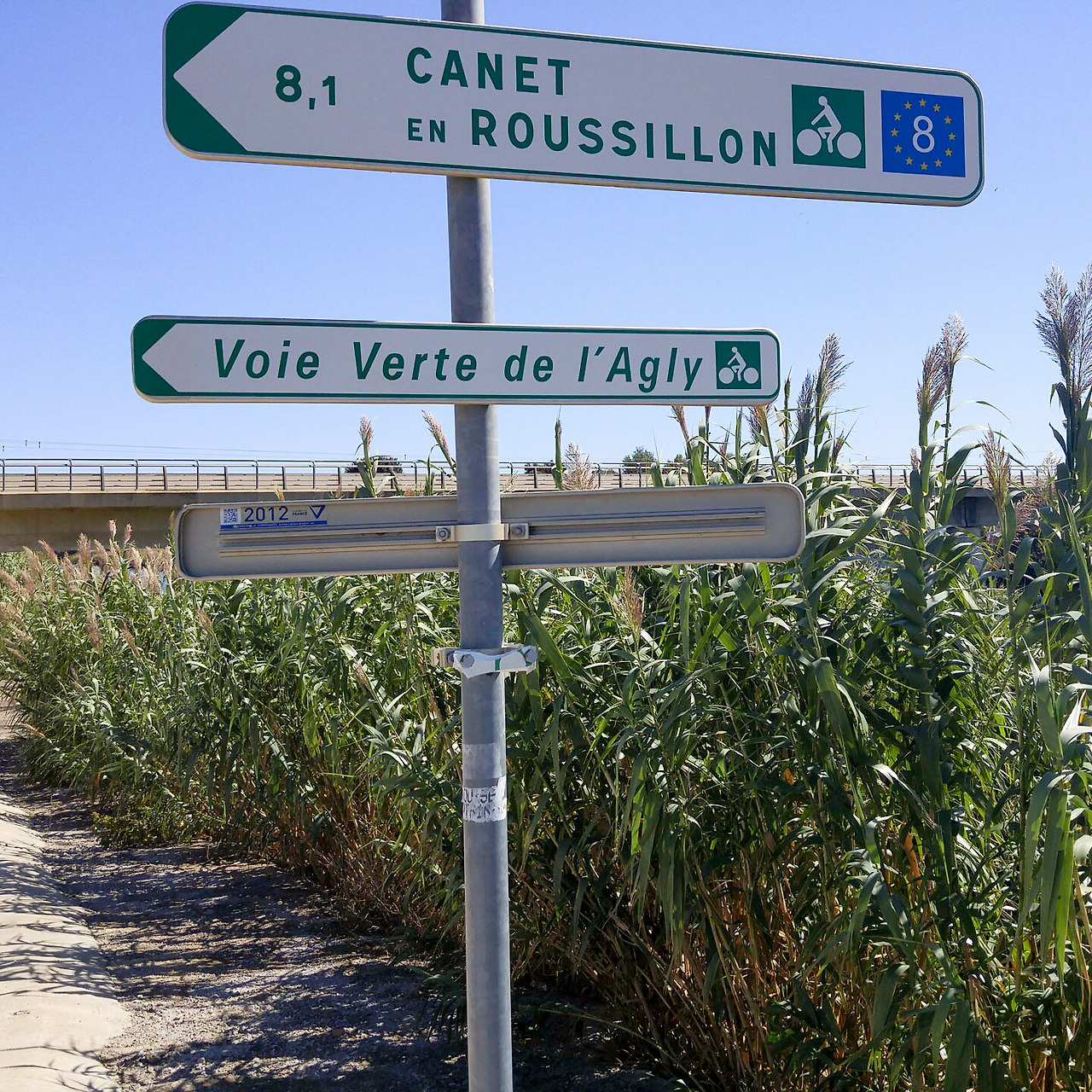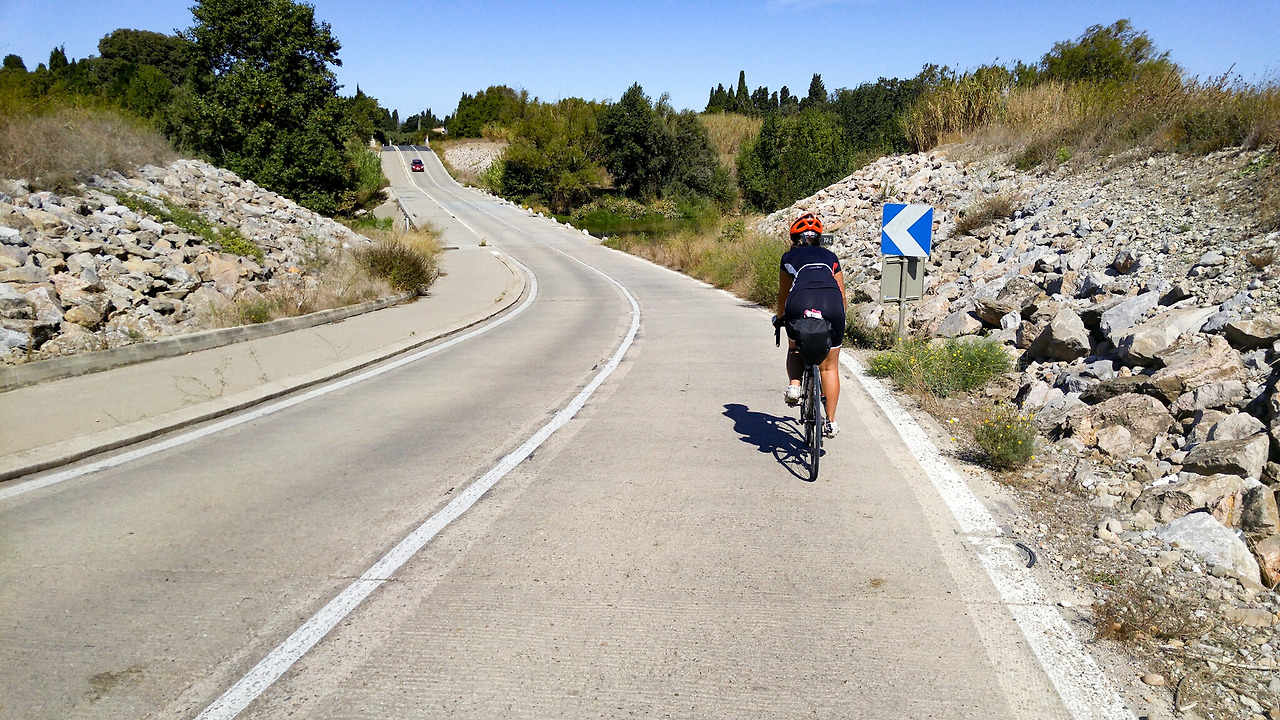 다리를 건너니 반가운 자전거길 표시가 보인다. 지중해 자전거 루트라 할 수 있는 유로벨로8(EV8) 자전거 도로의 일부 구간이다. 유로벨로8 구간은 우리나라처럼 매끈한 자전거길도 있지만 로드 바이크로는 달리기 힘든 비포장 구간도 많기 때문에 이를 완전히 따라가긴 힘들다.