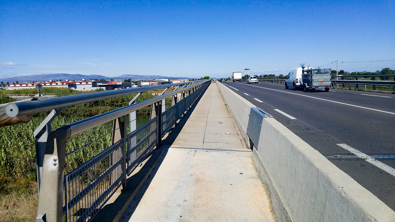 미개통 구간은 얼마 안 가 끝나고 도로가 끝난 곳에 공사장 출입 계단이 다리 옆으로 연결되어 있다. 저 다리만 건너면 나르본인데... 이런 경우가 한두 번도 아니니 자전거를 들쳐 매고 계단을 올라간다. 어쨌든 힘겹게 나르본에 입성한다.