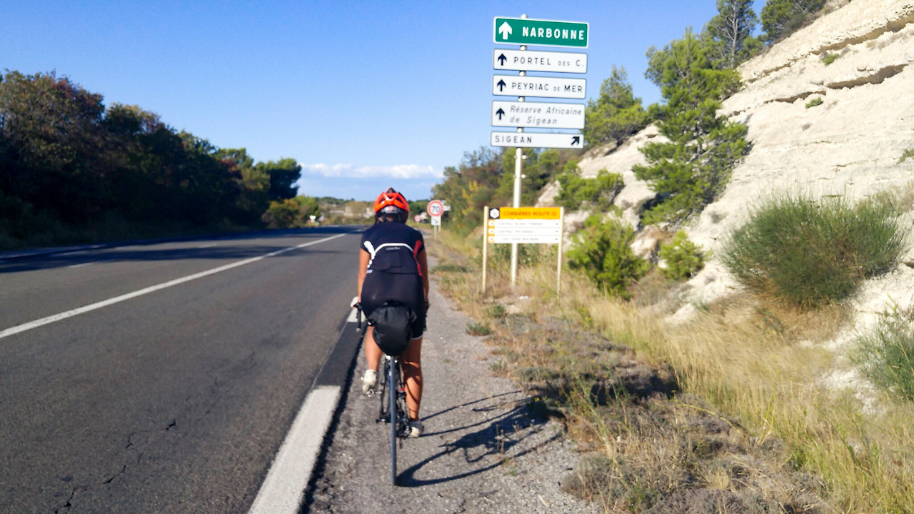 숙소가 있는 나르본으로 가는 D6009 도로는 차량 통행도 많은데 갓길까지 엉망이다. 한참 참고 달리다가 씨정(Sigean)을 지나서는 도저히 못 견디고 샛길로 빠진다.