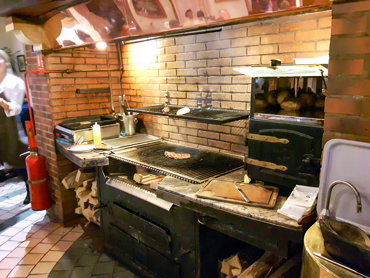 중앙의 그릴에서 고기가 지글지글 구워지고 있다.