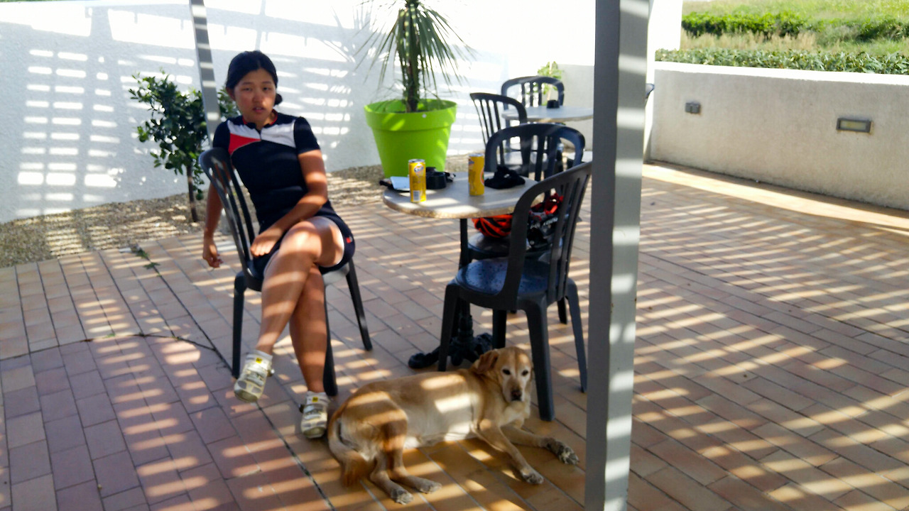 조금 큰 도로인 D570 도로와 까마르그를 가로지르는 D37 도로가 만나는 삼거리 근처에 주유소가 있다. 아무리 허허벌판이라지만 화장실도 없으니 주유소에서 음료수도 먹고 화장실도 가면서 휴식을 한다. 느긋하게 화장실에 다녀왔더니 우리 개인 듯이 앉아있는 주유소집 개가 있다. 이 녀석은 누가 와서 앉으면 그 옆에 능청스럽게 앉아서 음식을 안 밝히는 척하며 먹을걸 기다린다.