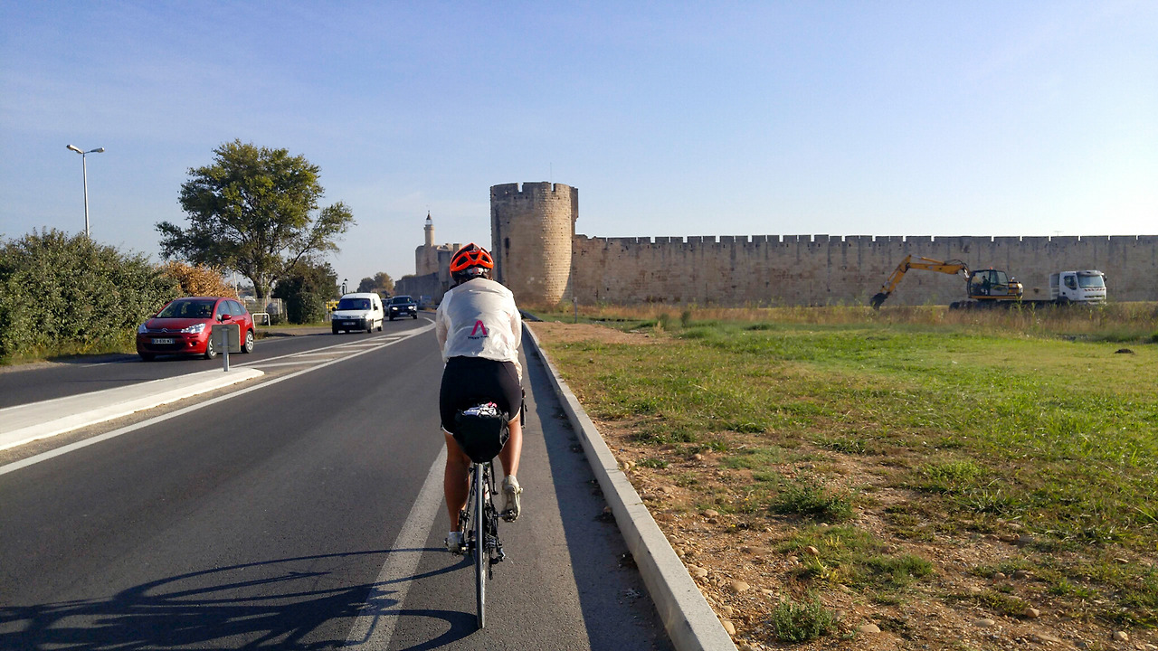 웬 성벽이 보인다. 에그 모르뜨(Aigues-Mortes)라는 마을이라고 한다. 저 성벽 안의 구시가지에 사람들이 모여 사는데 우리는 성벽 외곽으로 거쳐 지나간다. 성벽 아래 비포장길로는 사람들이 말을 타고 있었다.