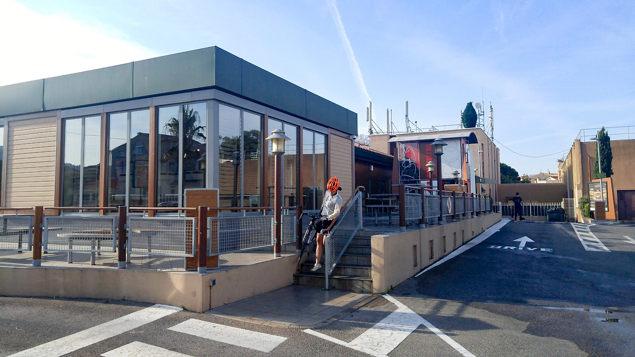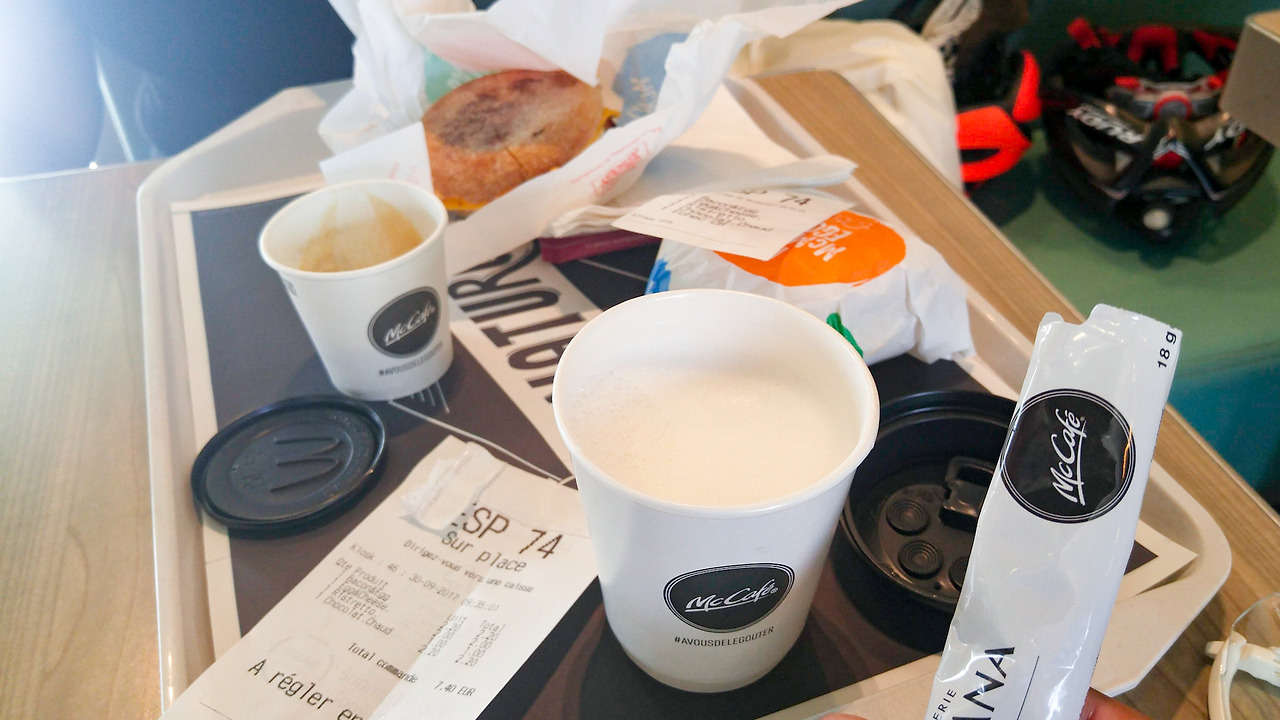 아무 생각 없이 자전거길을 따라 달리다 보니 해변에서 빠져나가야 할 길을 지나쳐버린다. 마침 근처에 맥도널드가 있으니 맥모닝으로 간단히 아침을 때운다. 프랑스의 맥모닝에는 핫초코가 있길래 주문했더니 따듯한 우유가 나오고 여기에 핫초코 가루를 타서 먹는다.