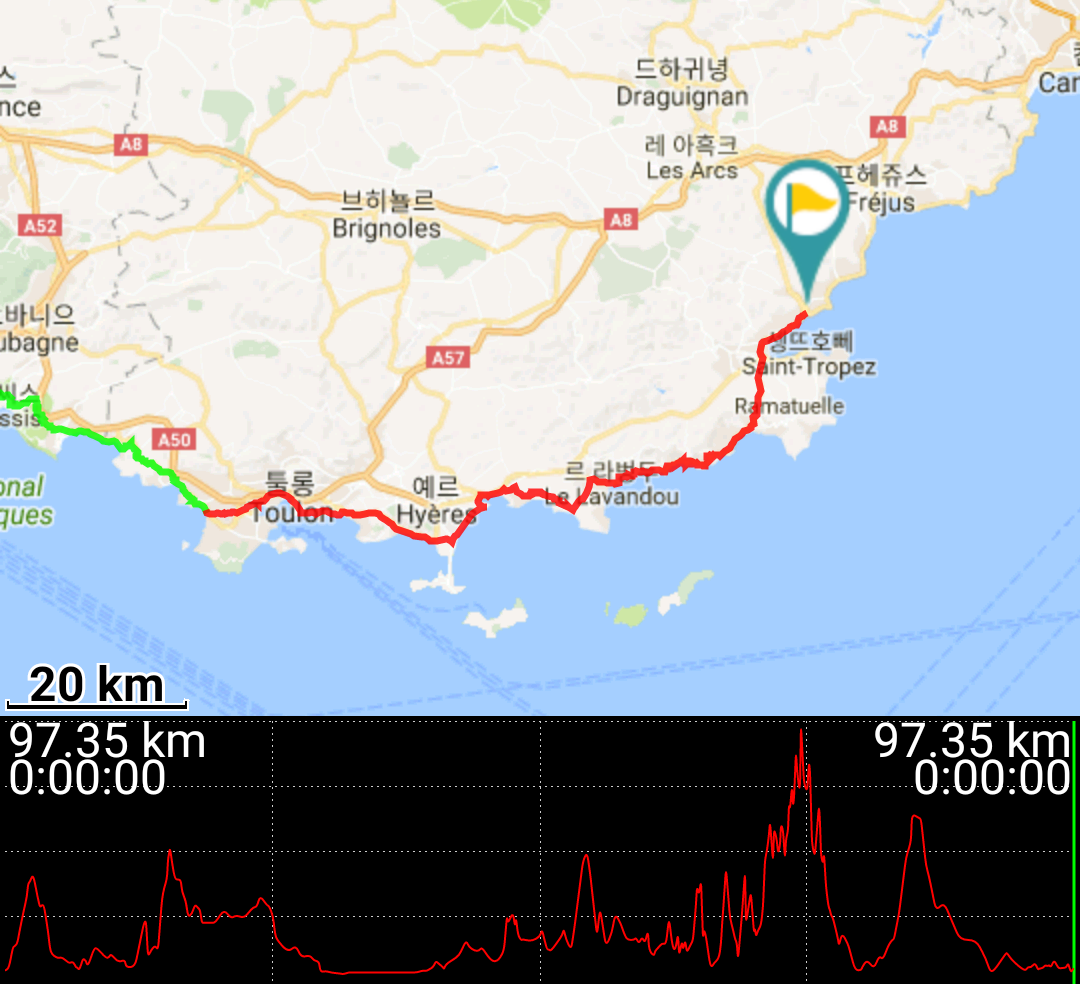 이동 경로 및 거리 : 식스 포 레 플라쥬(Six-four-les-Plages) - 생트 막심므(Sainte Maxime) 98 km
