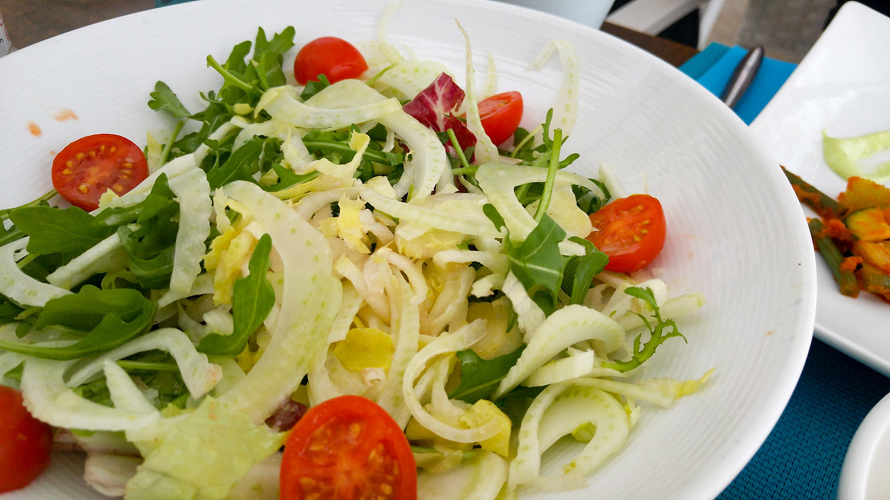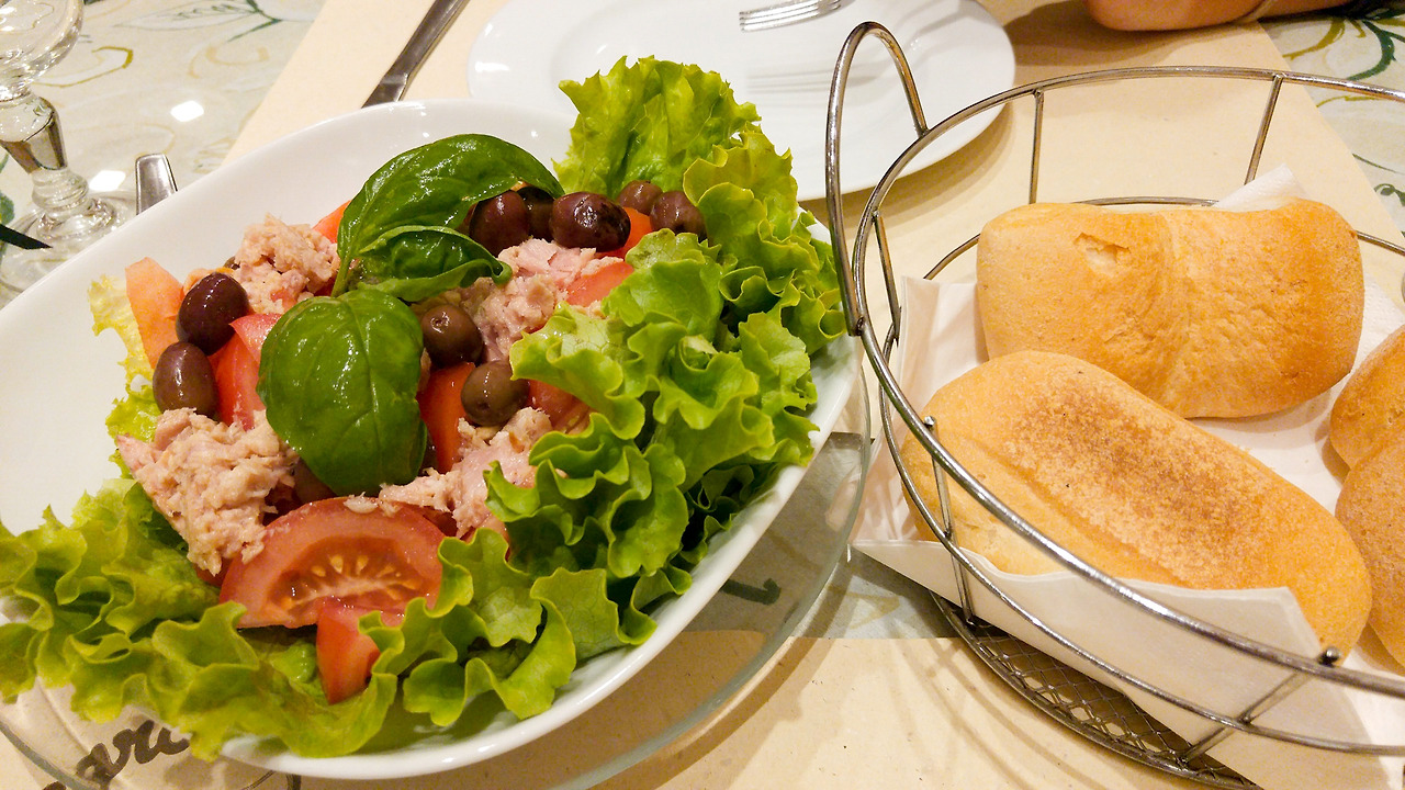 그 동안 일부러 스페인과 프랑스에서 파스타를 안 먹고 참았다. 파스타의 고장 이탈리아에 왔으니 이제 마음껏 먹자. 이탈리아 화이트 와인 하나와 샐러드를 주문하고...