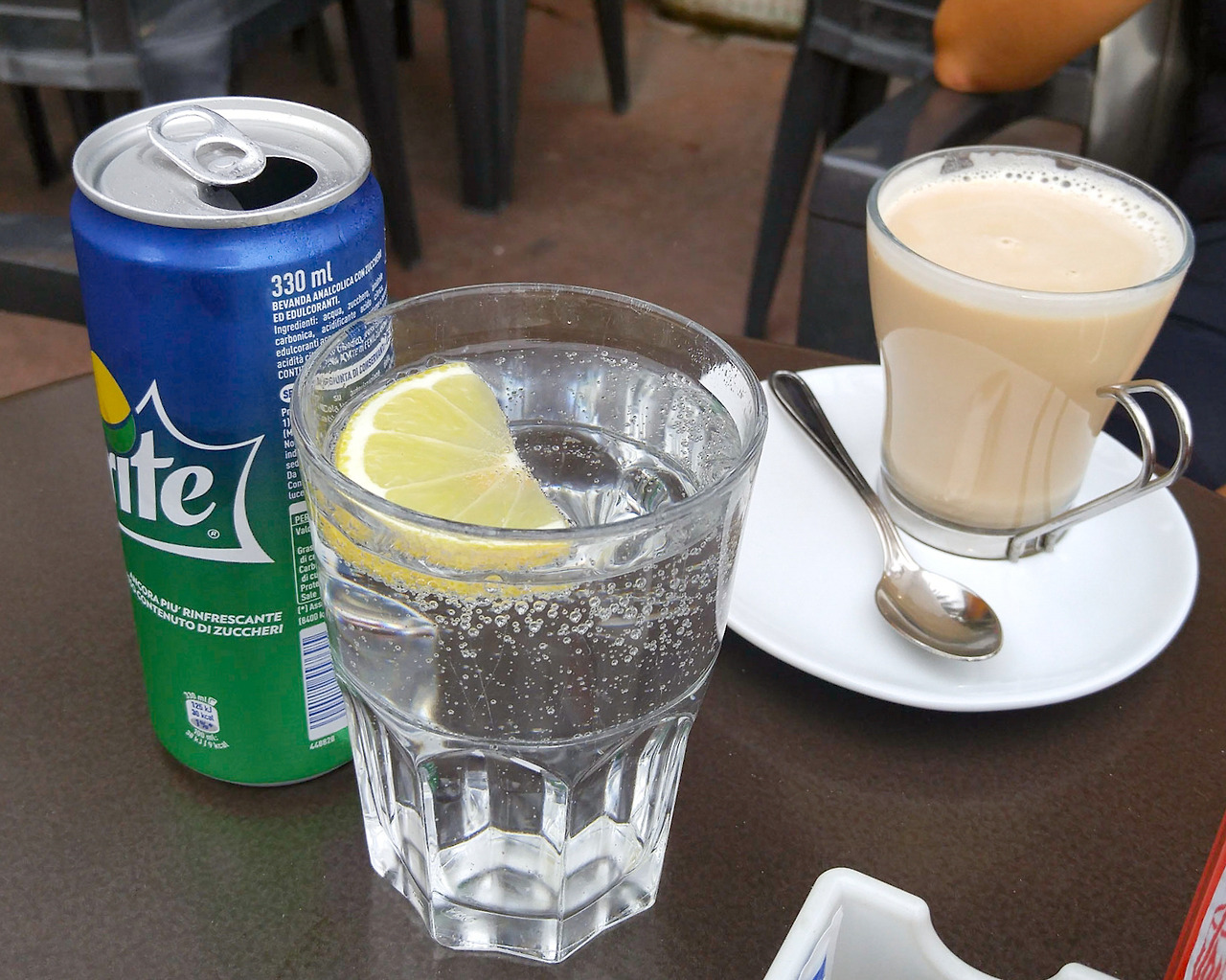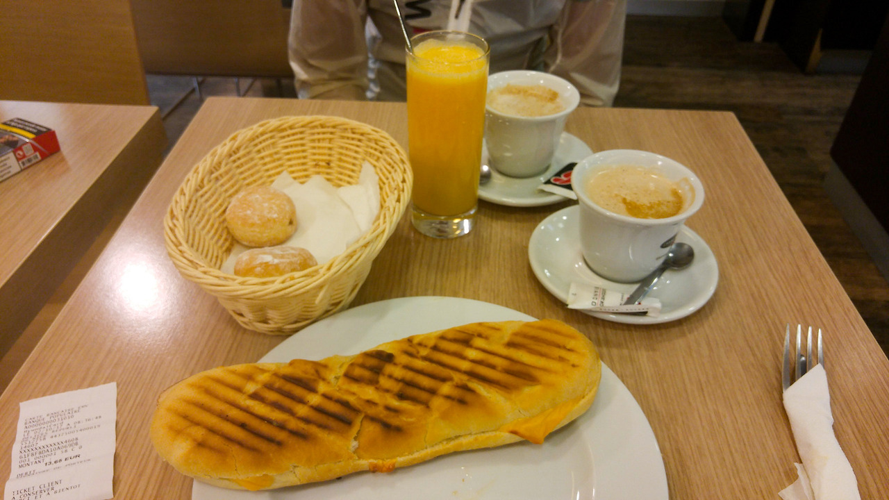 부지런한 직원 아줌마가 빠니니를 바로 기계에 눌러놓고 커피 두 잔에 에스프레소를 뽑으면서 오렌지를 꺼내와서 착즙하니 순식간에 주문한 메뉴가 준비되었다. 가격도 저렴하고 맛도 좋다.