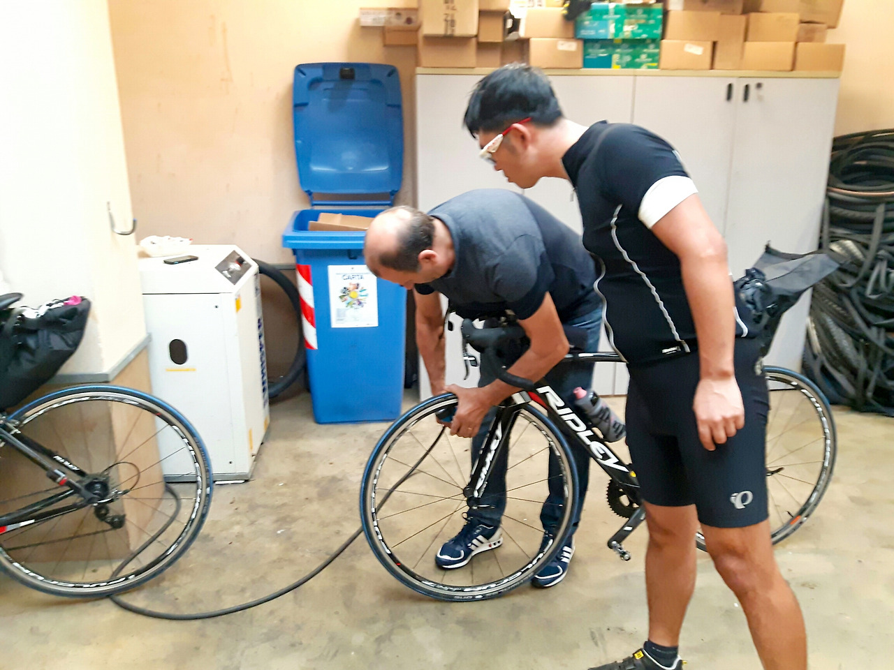 산 레모 시내를 관통해서 계속 이어지는 자전거길 옆에 자전거 가게들이 여럿 보인다. 그 중에 커보이는 자전거 가게에 가보니 지하에 있다. 그 동안의 펑크로 자전거 튜브가 또 모자른다. 프랑스보다 1 유로 싼 가격에 튜브를 두 개 사고 공기압을 좀 채우려니 사장님이 직접 에어컴프레셔로 공기를 채워준다. 역시, 이탈리아는 친절함의 수준이 프랑스와는 비교 불가다.