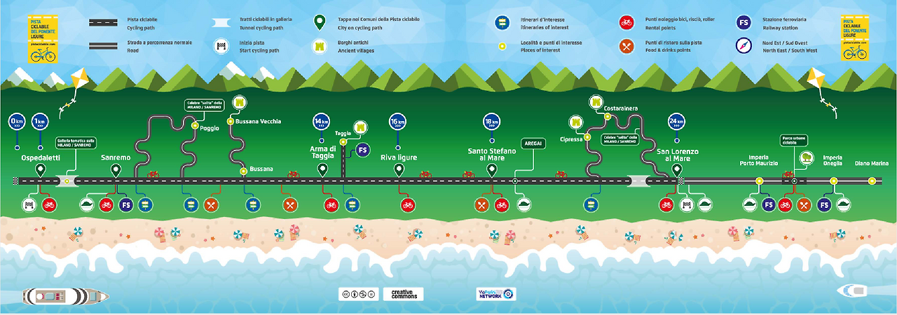 해변으로 달리다보니 우리나라 남한강 자전거길처럼 안 쓰는 기찻길을 자전거길로 고쳐놓은 곳이 있다. Pista ciclabile del ponente ligure라는 자전거길이 디아노 마리나까지 이어진다고 나온다.